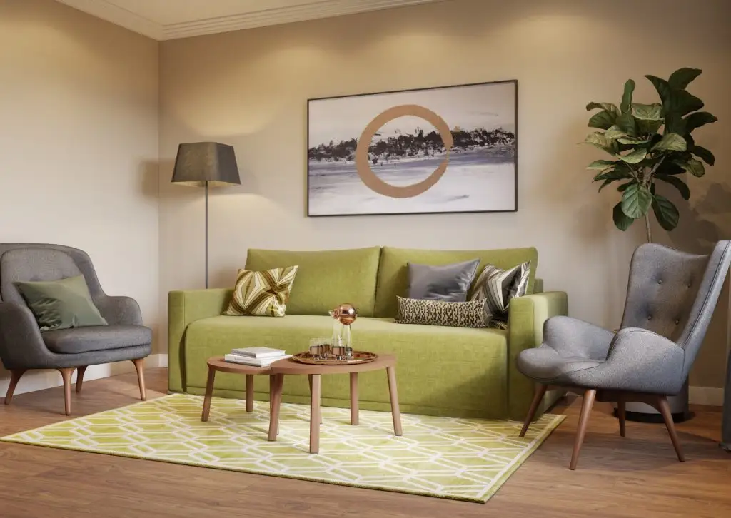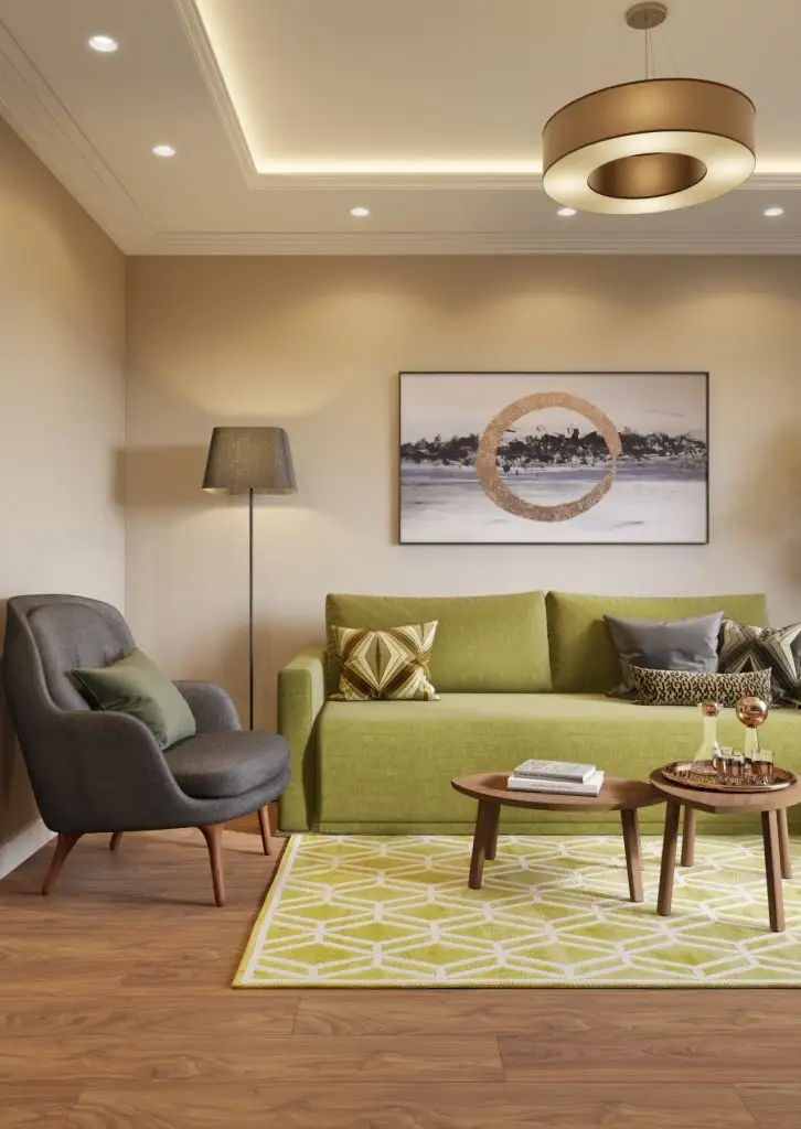 Depozitarea este compacta, concentrata pe un singur perete. Accentele de verde ale canapelei si covorului se integreaza minunat in contextul neutru al decorului.