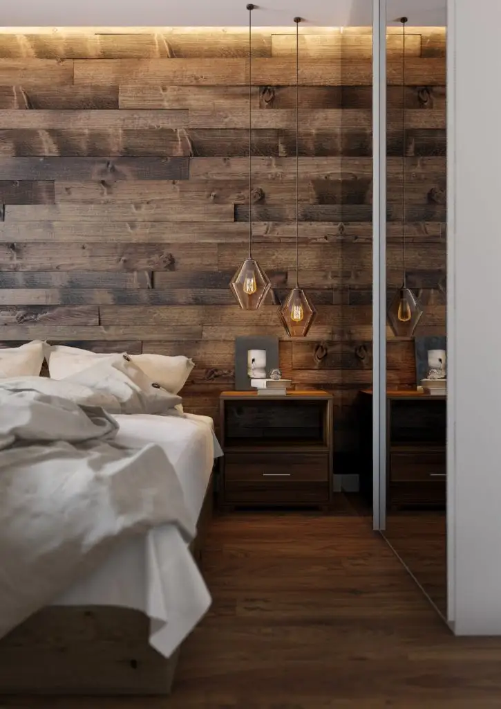 Dormitorul principal surprinde printr-un design usor neobisnuit pentru o astfel de incapere. Peretele-accent conturat in jurul patului atrage prin nuantele inchise si textura de lemn nefinisat. Corpurile de iluminat sunt adevarate obiecte de decor ce emana o lumina placuta, confortabila.