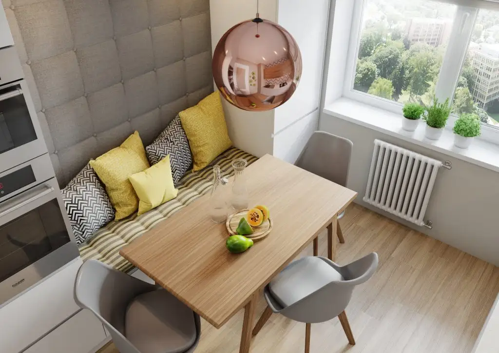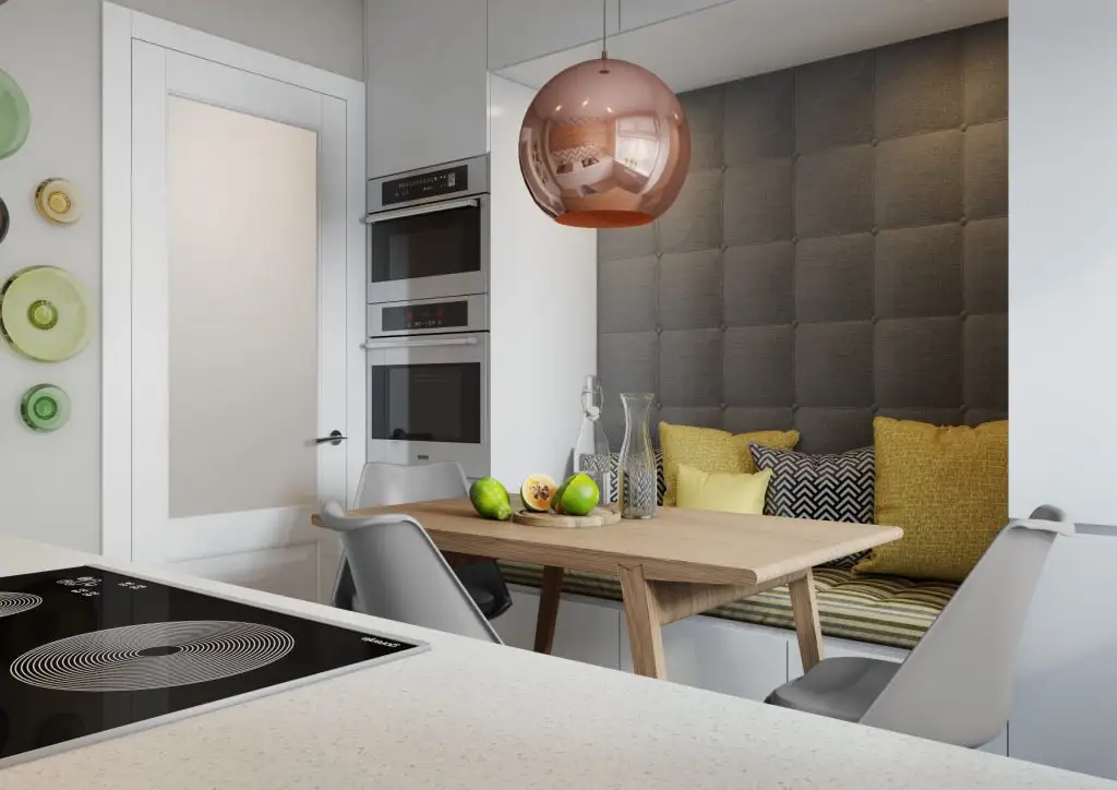 Ajungem si in bucatarie, unde regasim un minunat loc gandit pentru luat masa si socializat deopotriva. Pe langa zona de gatit, amenajarea unei bancute intre 2 corpuri de mobilier este un prilej de a petrece mai mult timp in bucatarie.
