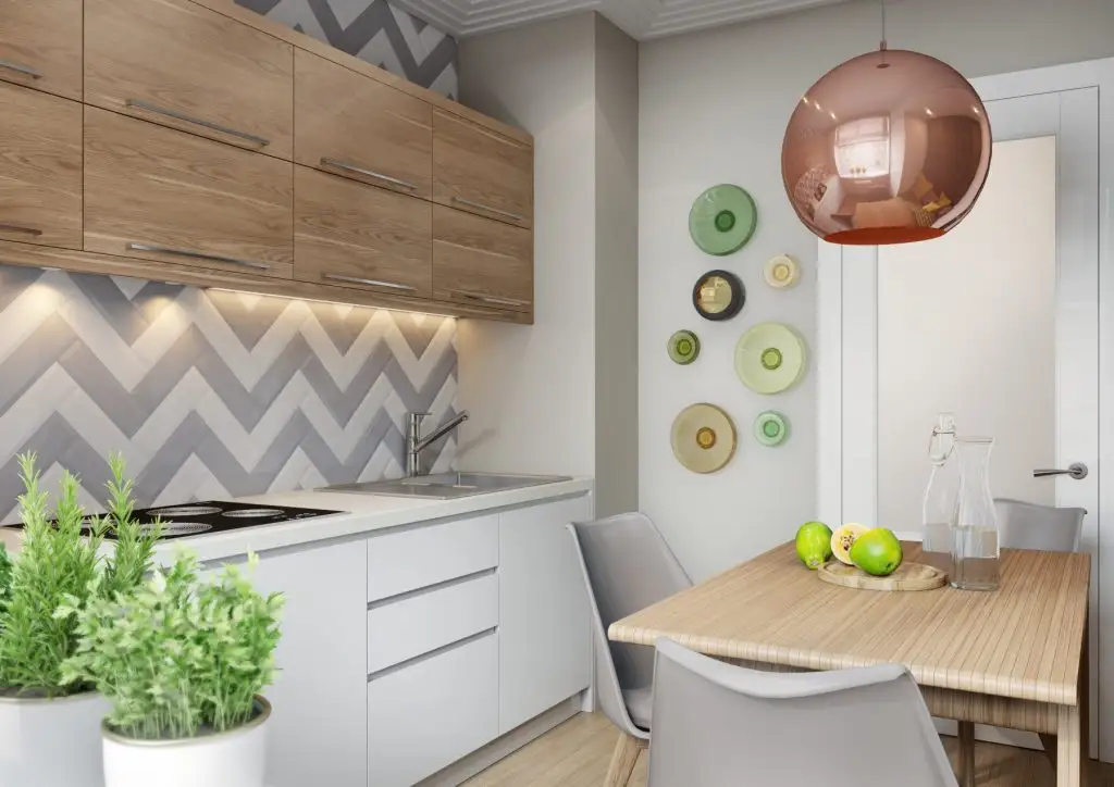 Spatiul este excelent optimizat, cu diferite corpuri care incastreaza o parte din electrocasnice, dar ofera si o depozitare suplimentara atat de binevenita intr-o bucatarie. Peretele-accent cu placi dispuse in zig-zag confera un plus de dinamica decorului.