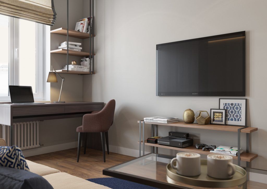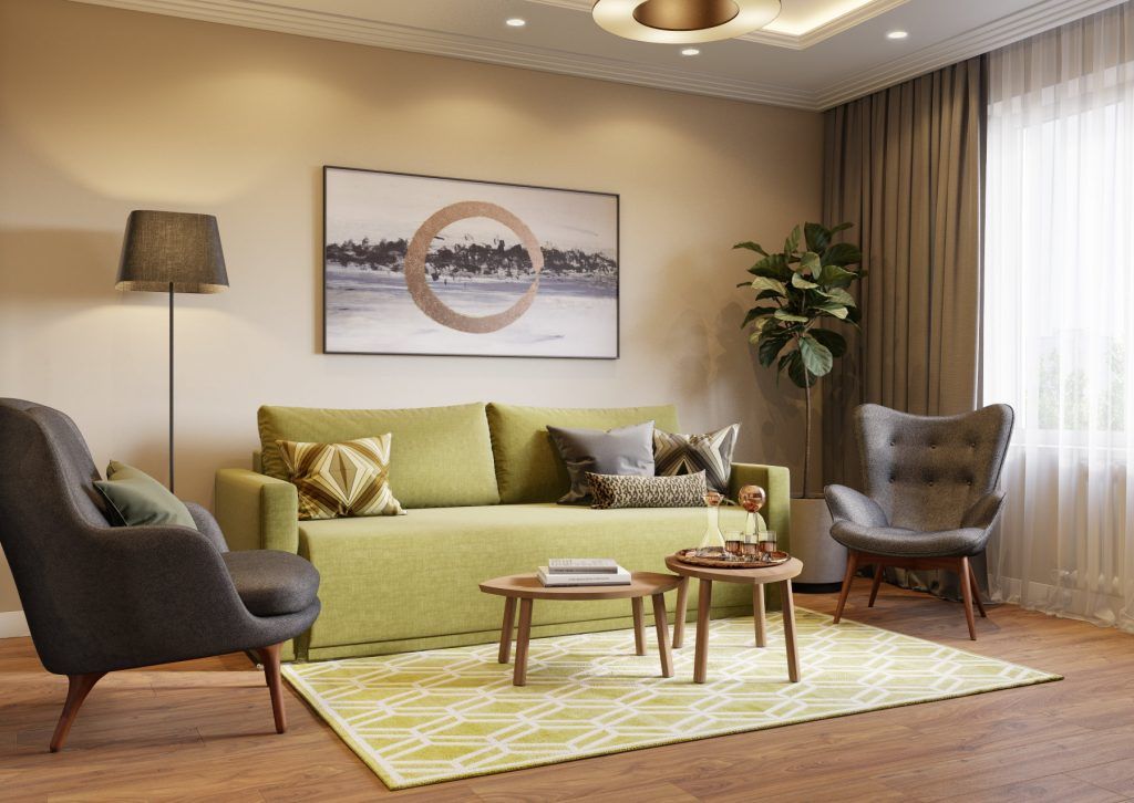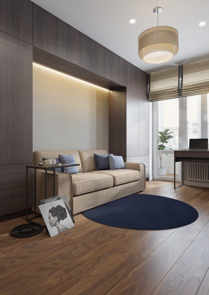 Depozitarea este compacta, concentrata pe un singur perete. Accentele de verde ale canapelei si covorului se integreaza minunat in contextul neutru al decorului.