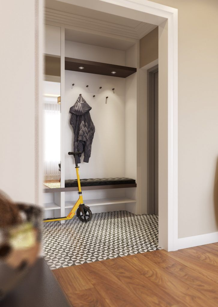 Holul de la intrare ofera spatii de depozitare atat pentru hainele voluminoase (vezi dulapul cu oglinzi), cat si pentru incaltaminte. Bancuta amenajatea aduce un plus de stil spatiului.