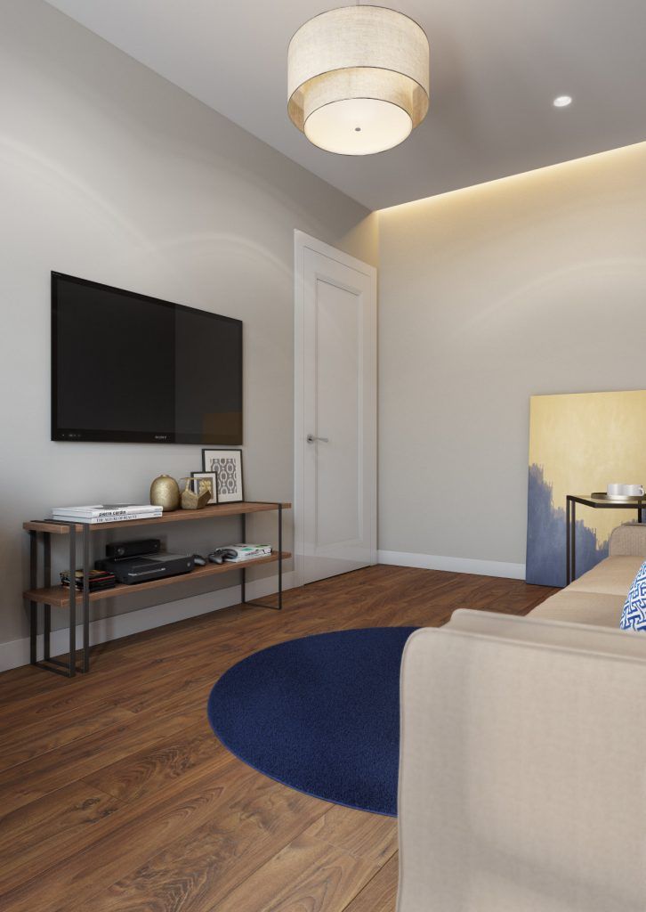 Pentru living arhitectii au mizat pe un decor minimalist, tinand cont de faptul ca toate camerele nu au suprafete tocmai generoase. Jocul geometriilor si al luminilor reuseste sa transforme camera intr-un primitoare, calda, eleganta si moderna in acelasi timp. Peretele placat din spatele televizorului reda un efect dramatic asupra decorului, iar restul mobilierului alb echilibreaza spatiul.