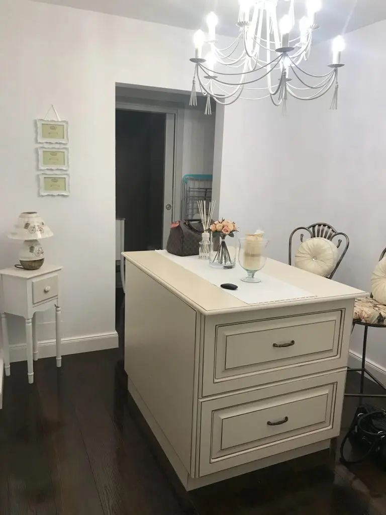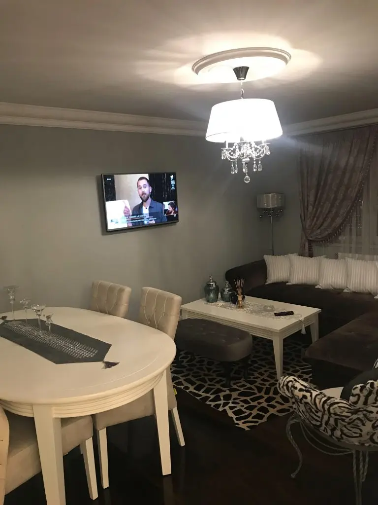 Livingul si zona de dining continua linia bucatariei, venind in completarea acesteia cu detalii textile elegante si imprimeuri, toate regasite in canapea, draperii, covor si accesorii. Delicatetea feminina si pretiozitatea isi gasesc locul in cadrul acestei transformari prin intermediul pietrelor semi-pretioase, care imbraca discret designul candelabrului.