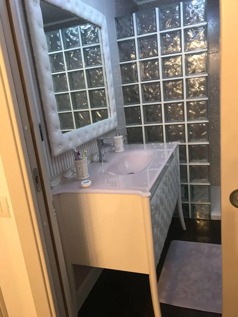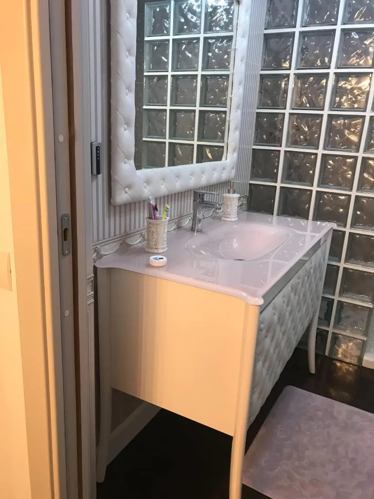 Peretele din sticla cu aspect cubic, cu rol de separare a zonei dusului, imparte camera in doua spatii diferite ca design, dar compatibile. Vorbim in acest caz de un pattern mural diferit, unde fara indoiala, punctul de atractie este reprezentat de oglinda generoasa incadrata cu o rama alba cu aspect de piele pozitionata pe un perete vintage si feminin. Mobilierul, lavoarul si restul accesoriilor vin in completarea imaginii retro, formand impreuna cu celelalte elemente componente, un spatiu romantic si extrem de elegant.