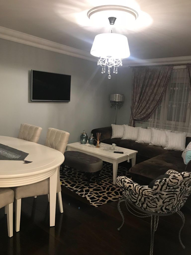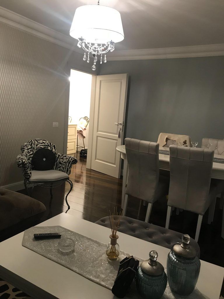 Livingul si zona de dining continua linia bucatariei, venind in completarea acesteia cu detalii textile elegante si imprimeuri, toate regasite in canapea, draperii, covor si accesorii. Delicatetea feminina si pretiozitatea isi gasesc locul in cadrul acestei transformari prin intermediul pietrelor semi-pretioase, care imbraca discret designul candelabrului.