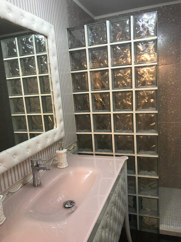 Peretele din sticla cu aspect cubic, cu rol de separare a zonei dusului, imparte camera in doua spatii diferite ca design, dar compatibile. Vorbim in acest caz de un pattern mural diferit, unde fara indoiala, punctul de atractie este reprezentat de oglinda generoasa incadrata cu o rama alba cu aspect de piele pozitionata pe un perete vintage si feminin. Mobilierul, lavoarul si restul accesoriilor vin in completarea imaginii retro, formand impreuna cu celelalte elemente componente, un spatiu romantic si extrem de elegant.