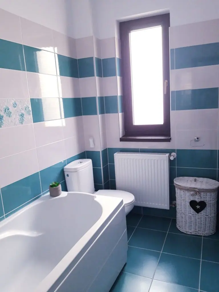 Dispunerea faiantei pe verticala in cazul baii face ca aceasta camera sa capete latime si profunzime. Simplitatea se remarca prin alegerea a doar doua nuante din punct de vedere al coloristicii, restul componentelor precum mobilierul si obiectele sanitare, respectand o paleta imaculata.