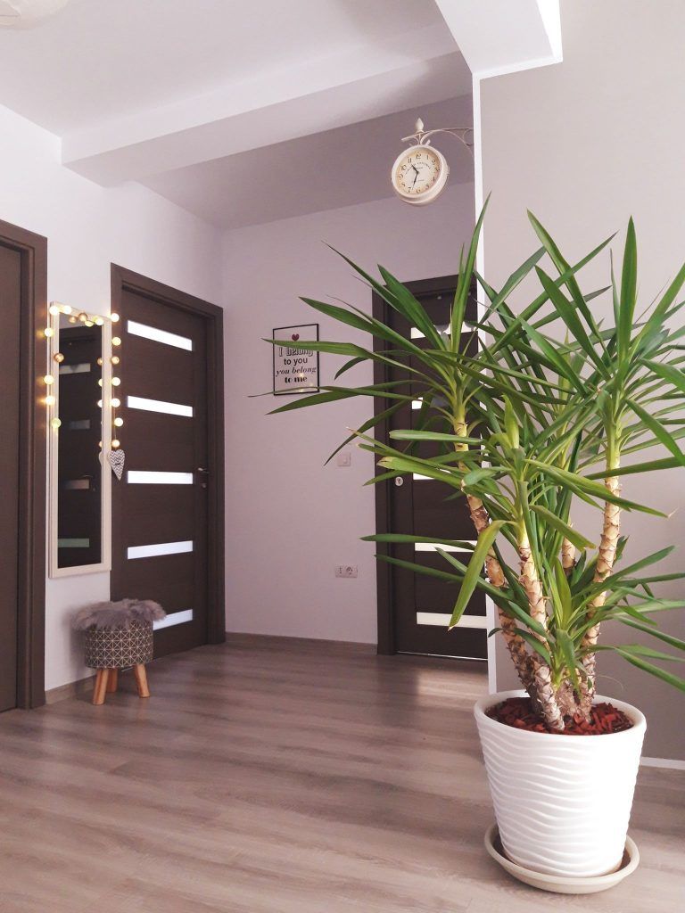 Holul generos impreuna cu zona living-ului alcatuiesc impreuna un spatiu deschis, marit vizual prin folosirea accentelor de nude, gri si lemn natural. Dimensiunea holului permite adaugarea unui pantofar, unui cuier si unei bancute cu aspect modern.