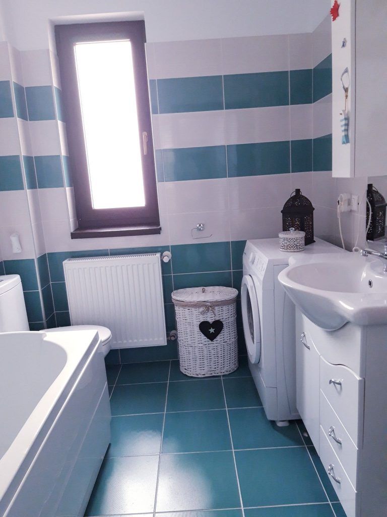 Dispunerea faiantei pe verticala in cazul baii face ca aceasta camera sa capete latime si profunzime. Simplitatea se remarca prin alegerea a doar doua nuante din punct de vedere al coloristicii, restul componentelor precum mobilierul si obiectele sanitare, respectand o paleta imaculata.