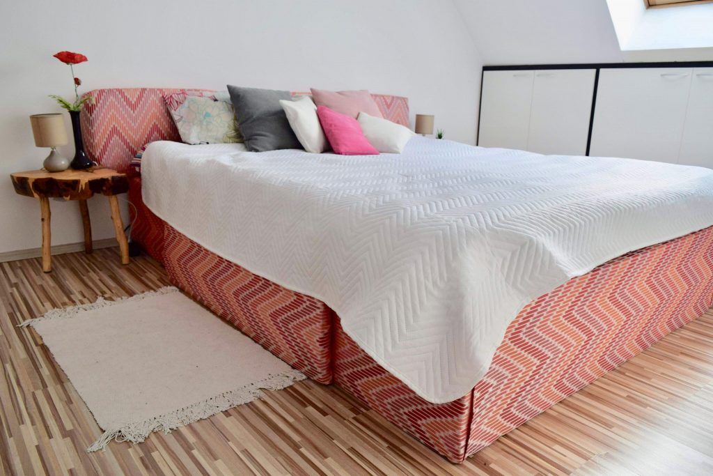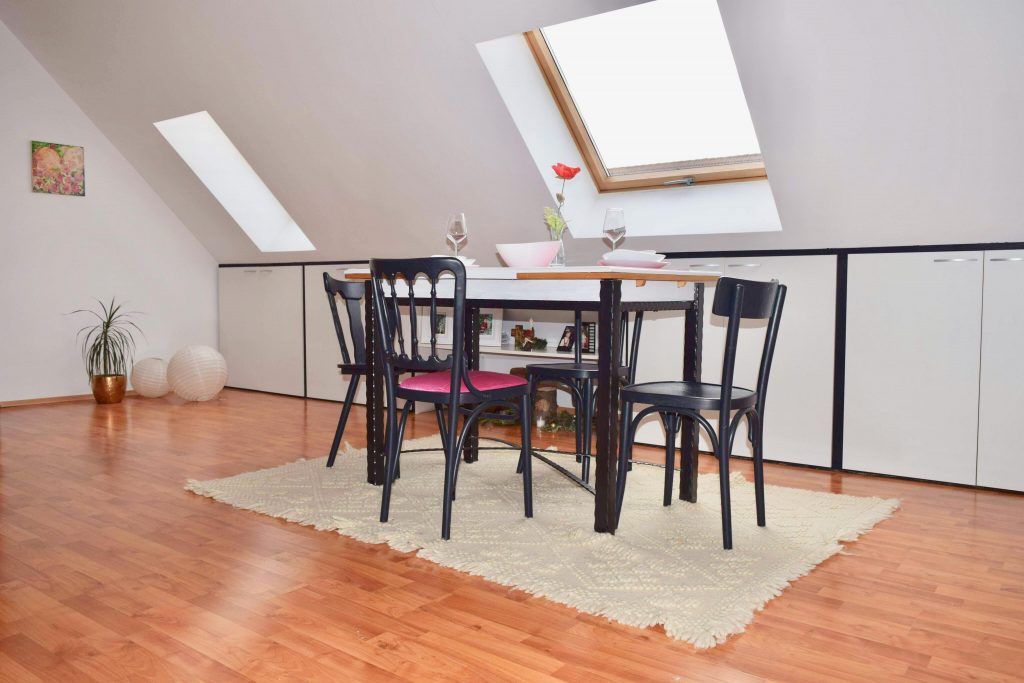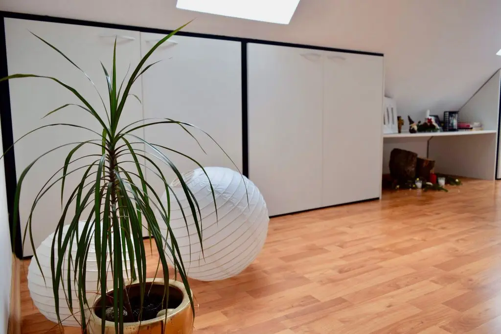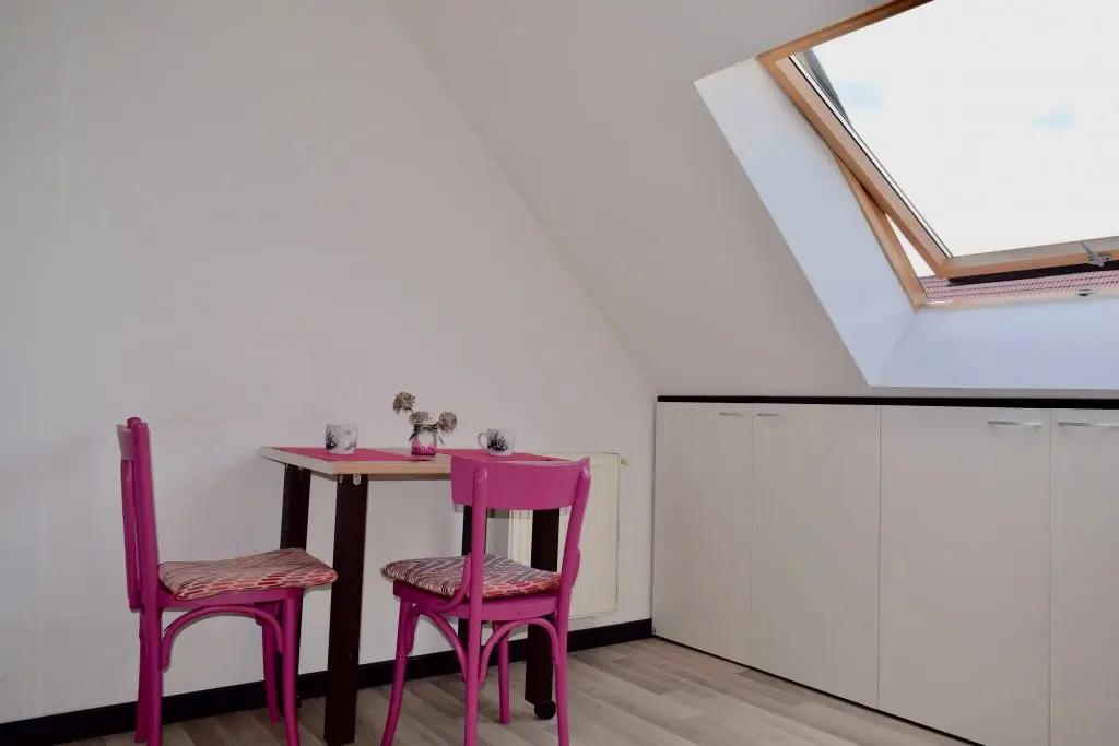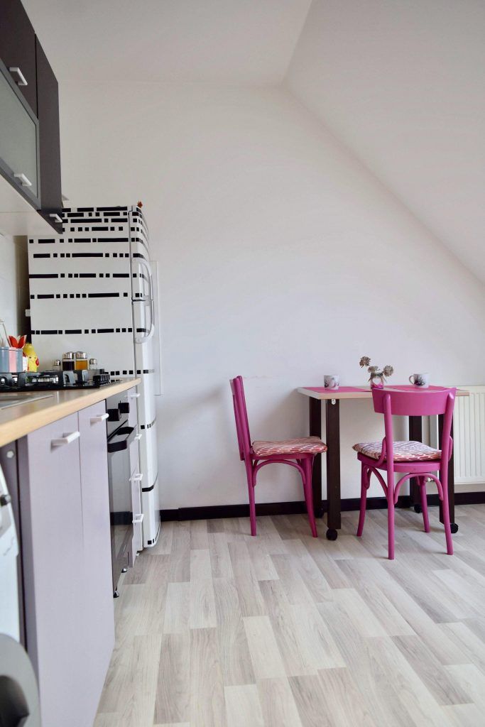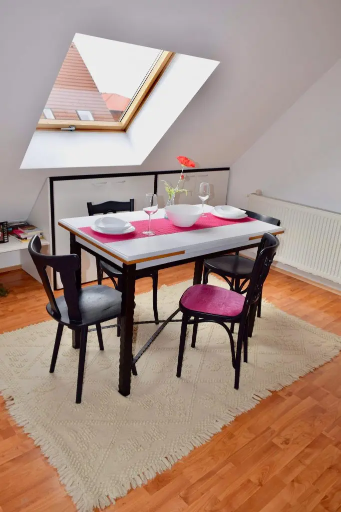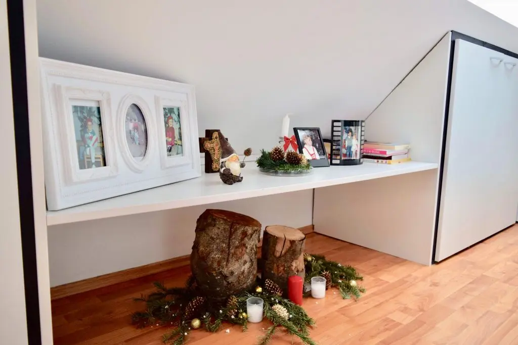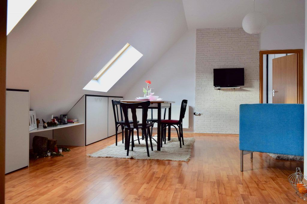 Mi-a placut foarte mult faptul ca se afla la mansarda si ca, avand pereti inclinati, am putut folosi acel spatiu pentru a incorpora mobilierul pentru depozitare, pastrand totul cat mai aerisit posibil; este destul de bine compartimentat si cuprinde hol, bucatarie, baie, camera de zi si un dormitor. Am gandit o amenajare cat mai simpla pe care sa o pot realiza cu un buget mic.