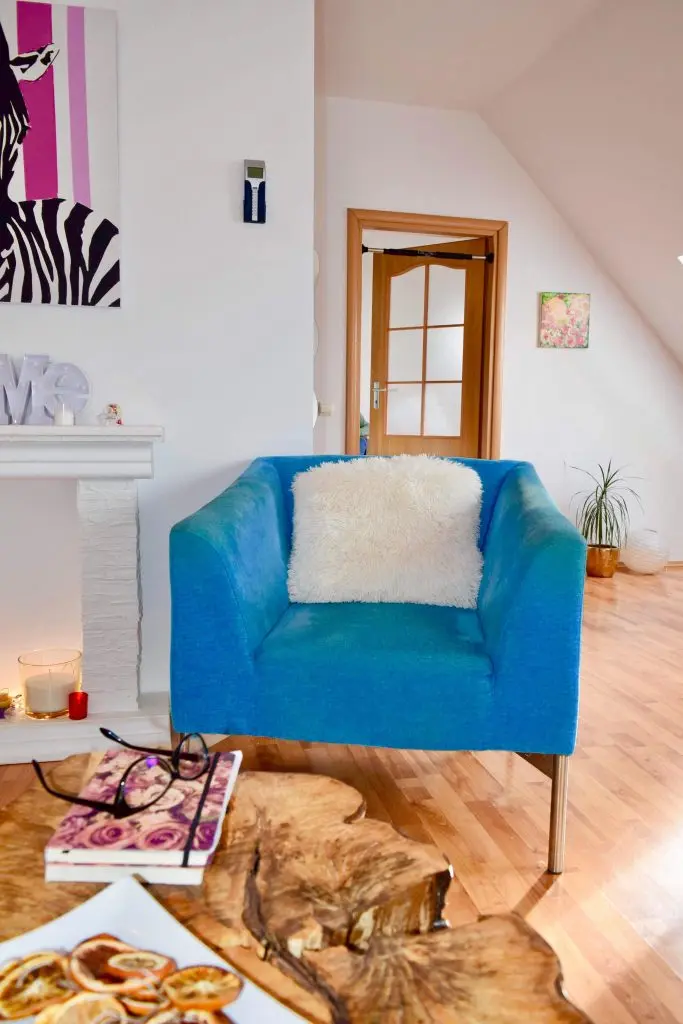 Fotoliul l-am luat de la locul de munca unde s-a schimbat mobilierul din sala de asteptare. Semineul fals si peretele din spatele televizorului le-am facut impreuna cu iubitul meu. Ambele sunt din polistiren peste care am dat cu pensula un strat de glet mai gros. Pentru confectionarea lor am avut nevoie de un pachet de polistiren expandat de 2 cm, dar ne-a ramas aproape jumatate.