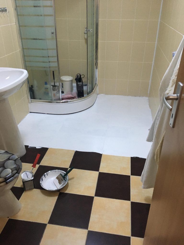 Pentru gresie nu am gasit o vopsea speciala, asa ca am improvizat. Am ales o vopsea pentru beton care poate fi folosita pentru garaje si marcaje. Din pacate, entuziasmul meu a fost prea mare si nu am pregatit cum ar fi trebuit gresia iar acum, dupa cateva luni de cand am vopsit, a inceput sa se cojeasca.