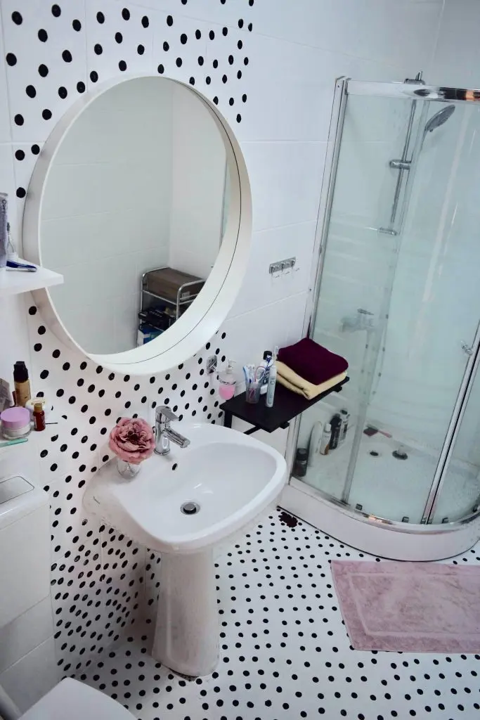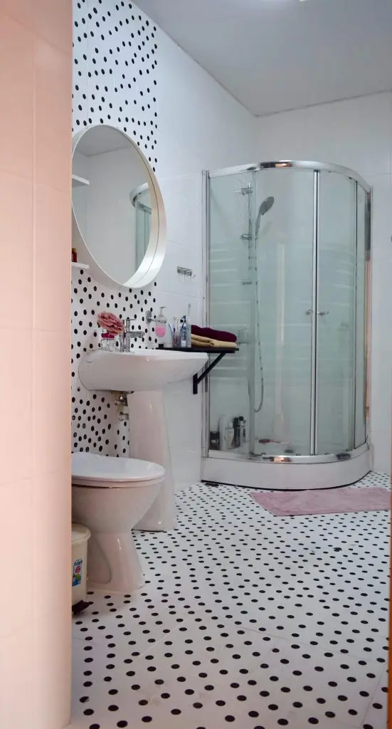 Aceasta vopsea este tot de la Oskar, pretul este de aproximativ 30 lei pentru o cutie de 750 ml. Eu am folosit trei cutii de vopsea. Bulinele le-am facut cu o pensula rotunda tot cu vopsea pentru beton. Am schimbat oglinda, am adaugat cateva etajere si asa am finalizat reamenajarea baii. Inca nu am gasit o solutie ca sa acopar gresia.