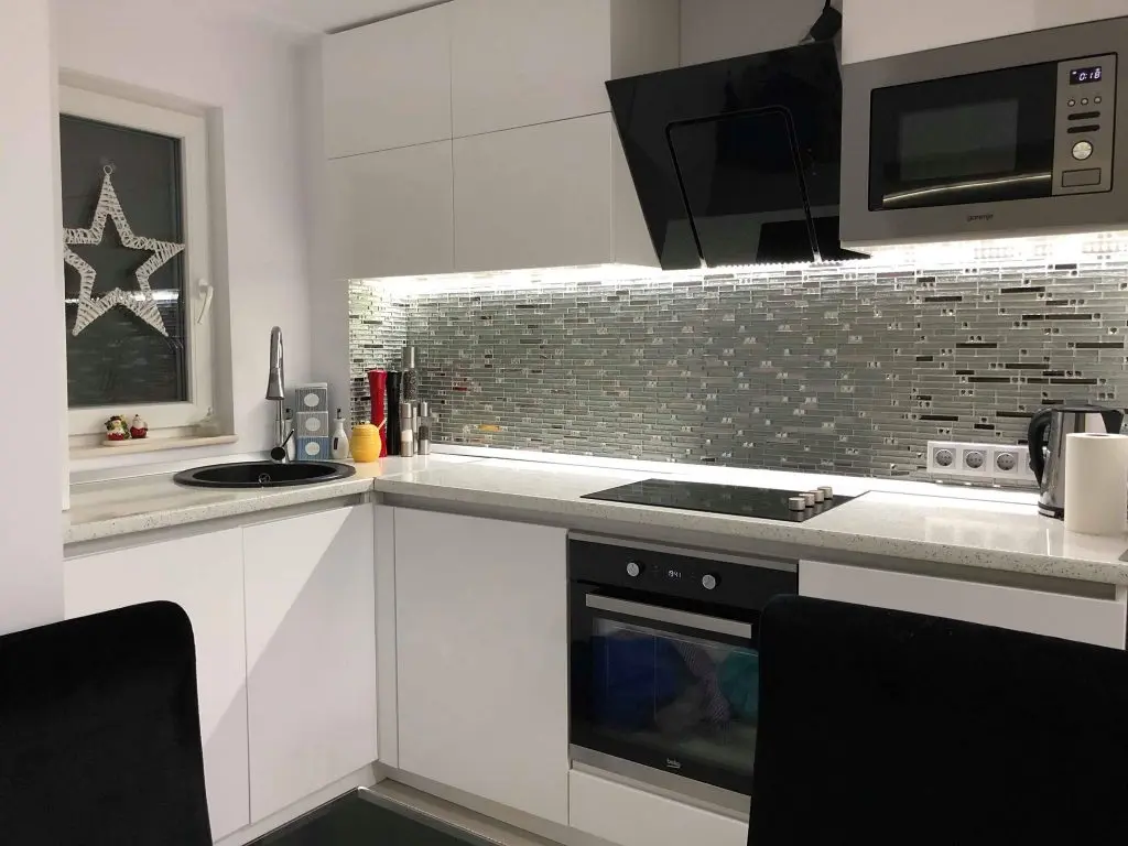 Accentele minimaliste si moderne se unesc in conturarea unei incaperi luminoase si ideale petrecerii unui timp de calitate in compania celor dragi. Nonculorile si finisajele argintii sunt cele care se evidentiaza in cea mai mare masura, iar detaliile textile si accesoriile sub forma de pietre semipretioase dau un aspect romantic si elegant. Mobilierul bucatariei este unul minimalist, in nuante lucioase de alb si negru. Central se pozitioneaza o masa cu design pretios, iar modelul tapitat al scaunelor respecta tiparul canapelei alaturate.