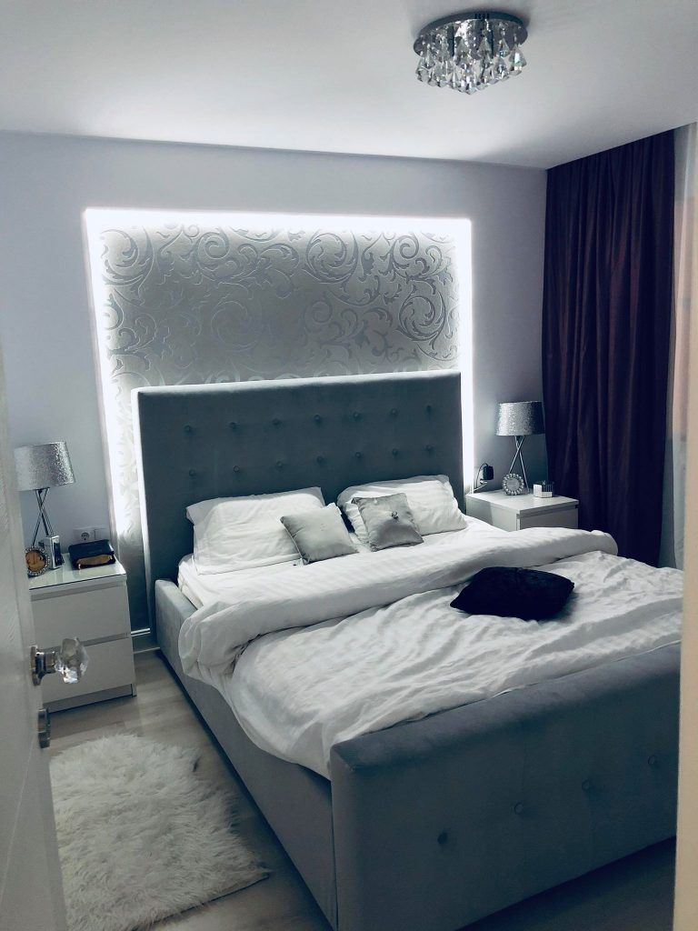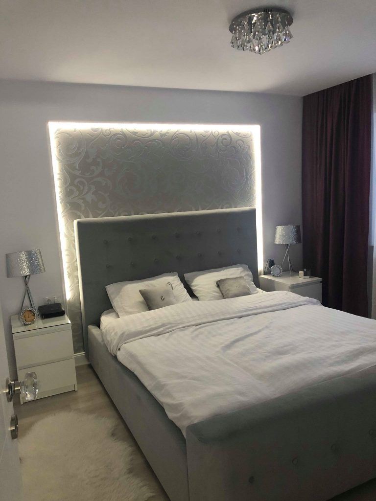 Dormitorul este camera care duce povestea mai departe, pastrand finisajele si atmosfera conturata de celelalte incaperi. Modelul tabliei patului se imbina elegant cu elementele de iluminat artificial si cu pattern-ul peretelelui pe care acesta se pozitioneaza. Noptierele sunt accesorizate in egala masura cu cate o veioza cu detalii argintii, iar textura covorasului ne reaminteste imaginea spatiului de relaxare amenajat in zona balconului.
