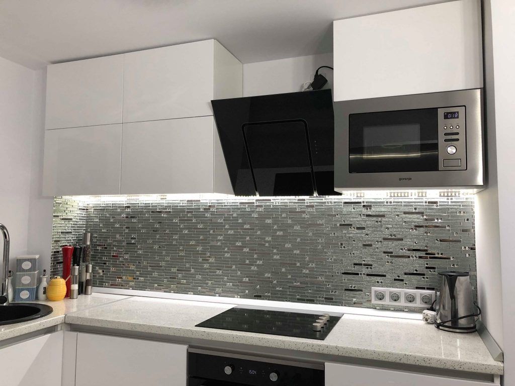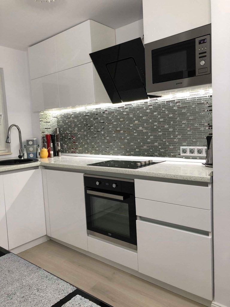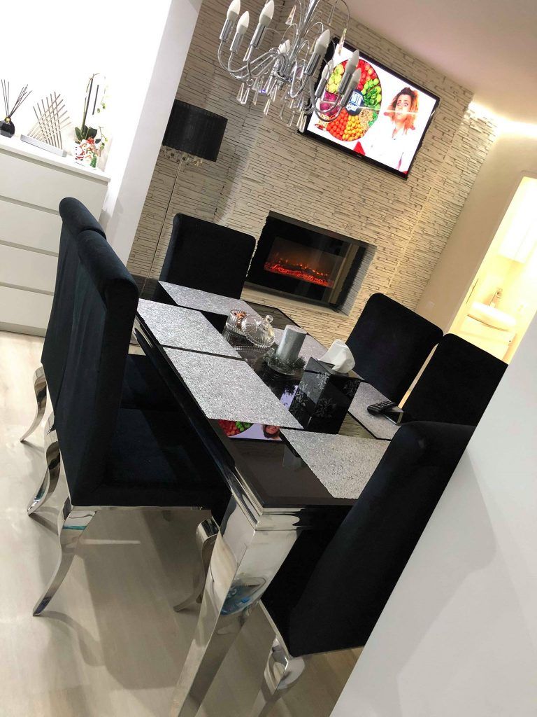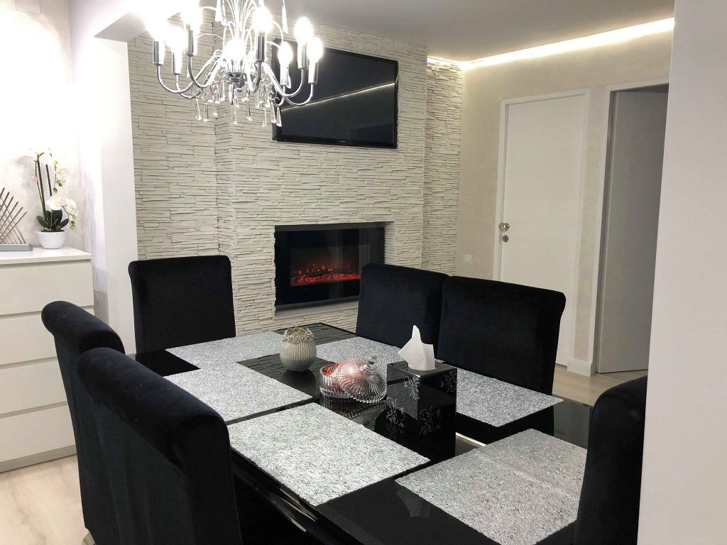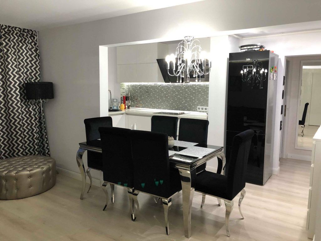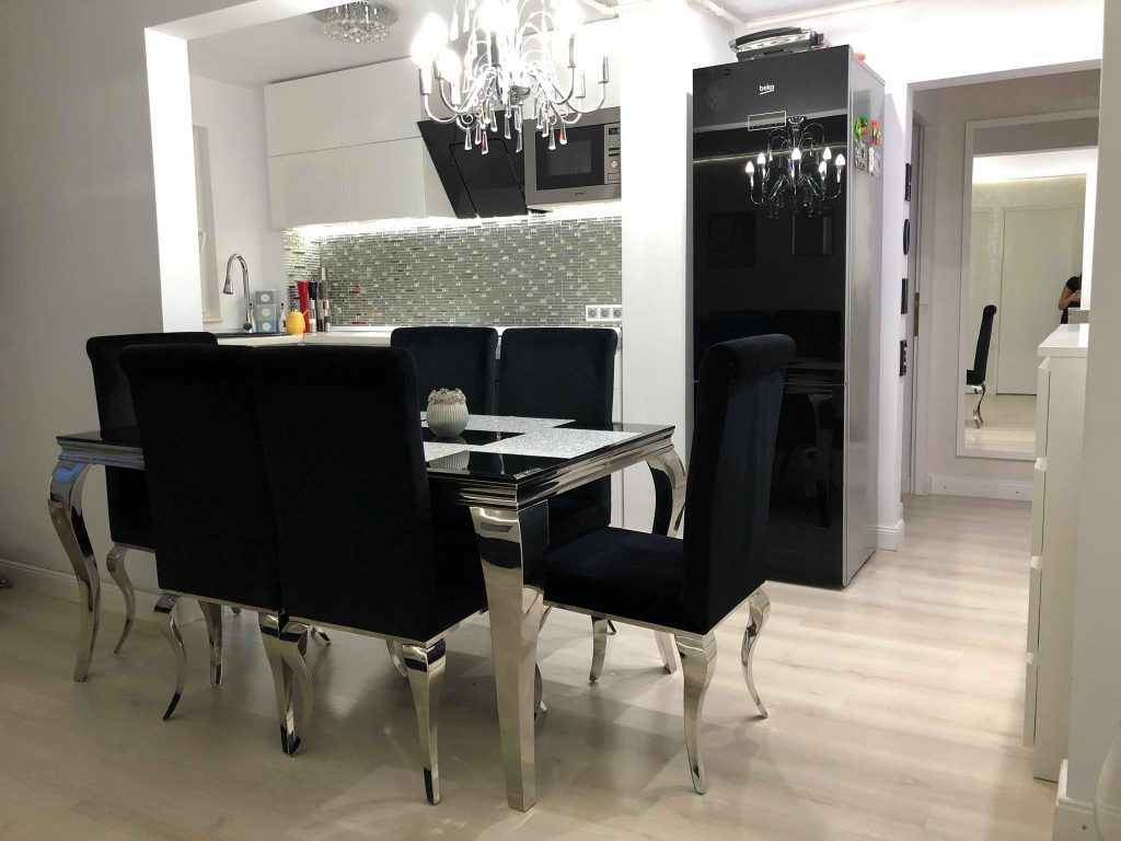 Accentele minimaliste si moderne se unesc in conturarea unei incaperi luminoase si ideale petrecerii unui timp de calitate in compania celor dragi. Nonculorile si finisajele argintii sunt cele care se evidentiaza in cea mai mare masura, iar detaliile textile si accesoriile sub forma de pietre semipretioase dau un aspect romantic si elegant. Mobilierul bucatariei este unul minimalist, in nuante lucioase de alb si negru. Central se pozitioneaza o masa cu design pretios, iar modelul tapitat al scaunelor respecta tiparul canapelei alaturate.