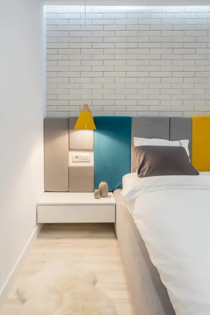 Pentru dormitor, am ales un pat facut la comanda cu tablie capitonata pentru un plus de confort si spatiu de depozitare sub el. Paleta cromatica cuprinde accente de galben si turcoaz, echilibrate de alb si griuri. Cel de-al doilea dormitor a fost gandit ca o camera de relaxare, de vazut meciuri si filme cu prietenii.