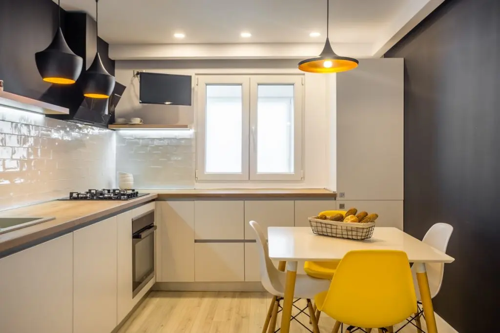 In bucatarieam mizat pe un design simplu, fara corpuri suspendate, dar care sa faca fata tuturor cerintelor de depozitare. Astfel, am incorporat masina de spalat vase, frigiderul, cuptorul si restul accesoriilor dorite. Peretii sunt vopsiti cu vopsea pentru table de scris astfel incat cei doi isi pot nota retetele preferate, liste cu lucruri de cumparat sau lucruri de rezolvat in ziua respectiva. Am creat astfel un contrast intre negrul peretilor si albul mobilierului, iar tusele de galben aduc un plus de veselie spatiului.