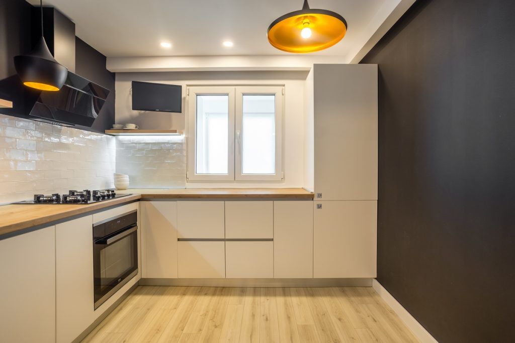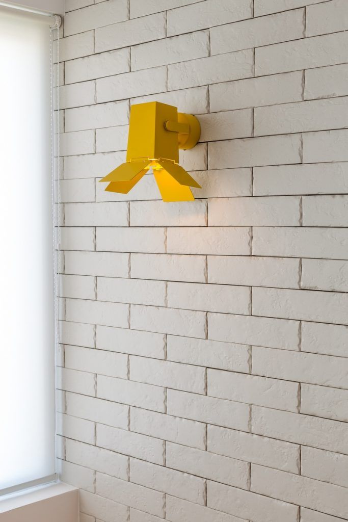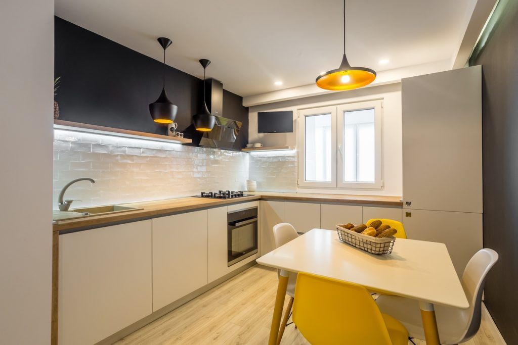 In bucatarieam mizat pe un design simplu, fara corpuri suspendate, dar care sa faca fata tuturor cerintelor de depozitare. Astfel, am incorporat masina de spalat vase, frigiderul, cuptorul si restul accesoriilor dorite. Peretii sunt vopsiti cu vopsea pentru table de scris astfel incat cei doi isi pot nota retetele preferate, liste cu lucruri de cumparat sau lucruri de rezolvat in ziua respectiva. Am creat astfel un contrast intre negrul peretilor si albul mobilierului, iar tusele de galben aduc un plus de veselie spatiului.