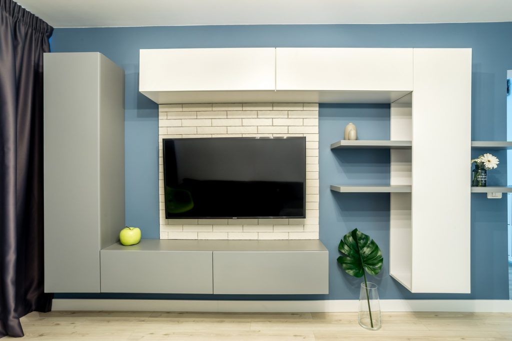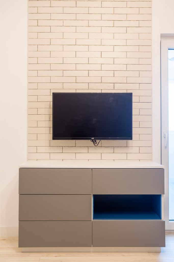 In living, am optat pentru un dressing cu usi acoperite cu oglinzi, desfasurat pe toata latimea camerei, alaturi de un mobilier T V cu diverse spatii de depozitare, atat vizibile cat si mascate.