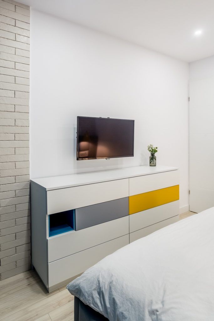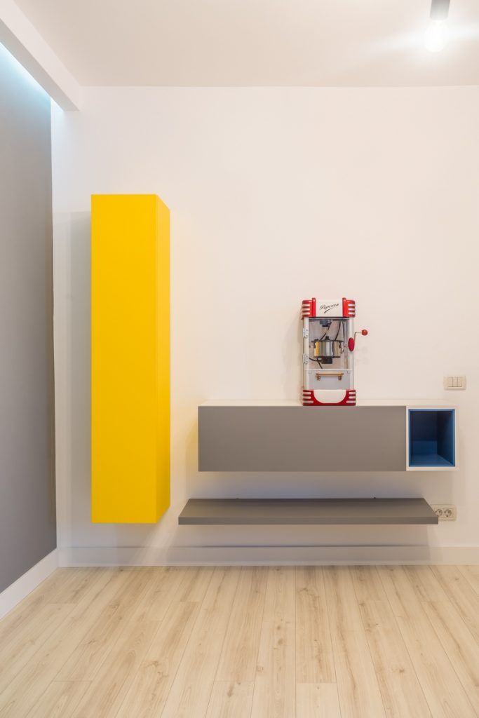 Pentru dormitor, am ales un pat facut la comanda cu tablie capitonata pentru un plus de confort si spatiu de depozitare sub el. Paleta cromatica cuprinde accente de galben si turcoaz, echilibrate de alb si griuri. Cel de-al doilea dormitor a fost gandit ca o camera de relaxare, de vazut meciuri si filme cu prietenii.