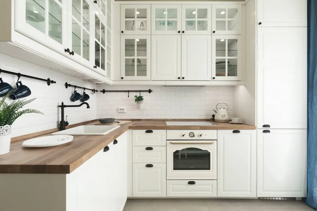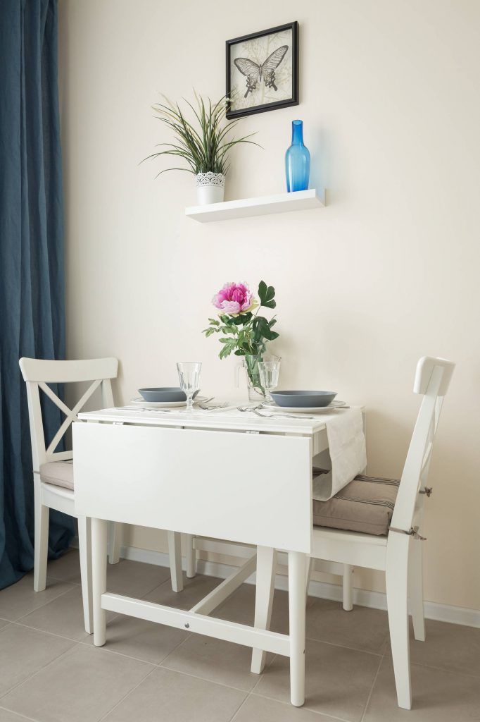 Bucataria aduce in plus, spre deosebire de celelalte incaperi, o serie de accente feminine exprimate prin intermediul accesoriilor cu rol decorativ. Mobilierul pe colt, de un alb imaculat, vine cu un aspect usor vintage si elegant, iar in completarea lui, pattern-ul este respectat si de catre electrocasnicele pe care le incastreaza. Si aici albul este cel care se remarca, singurele pete de culoare regasindu-se in draperii si plante decorative. Pentru a putea exploata intr-o maniera cat mai fidela spatiul pus la dispozitie, se opteaza pentru o masa pliabila.