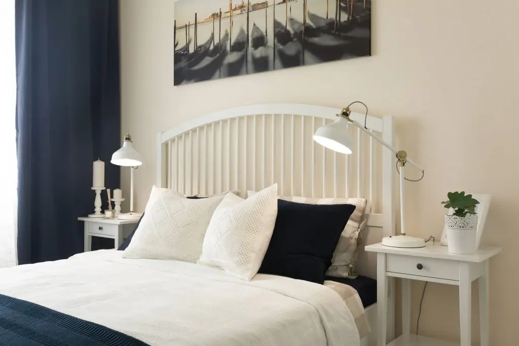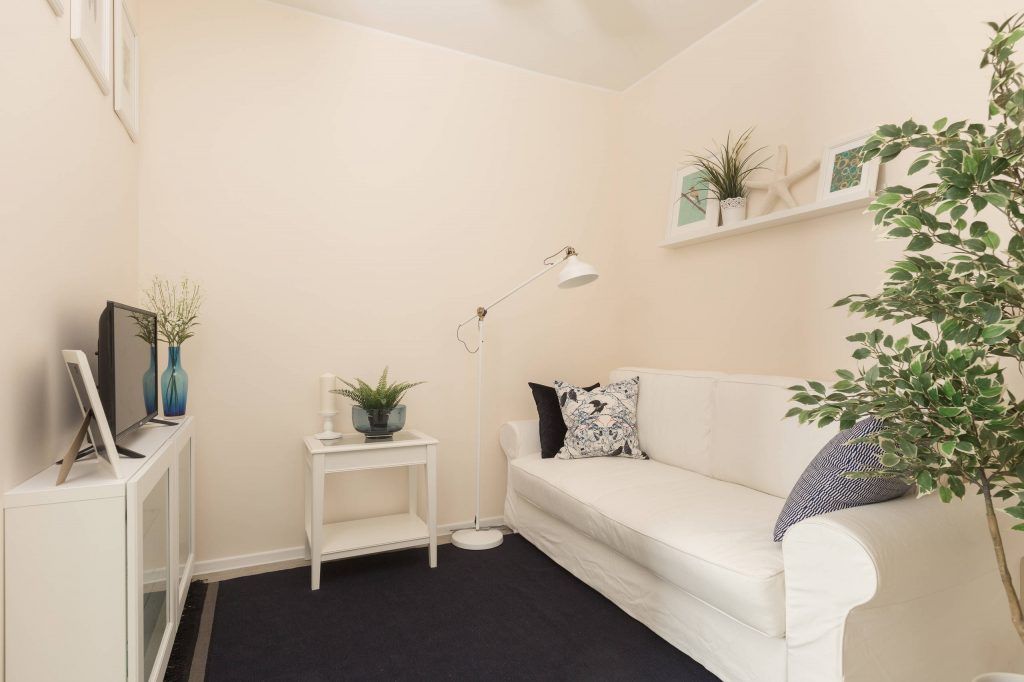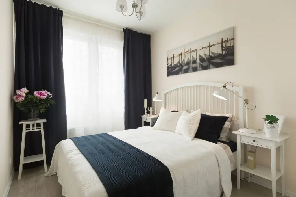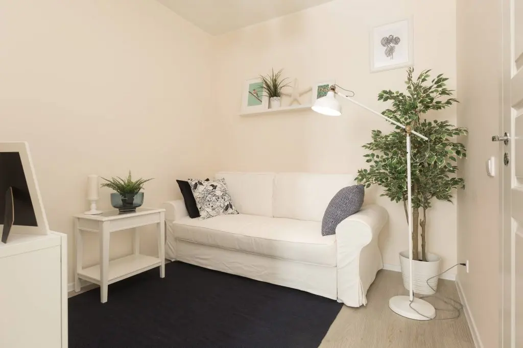 Spatiul dormitorului se compune dintr-un pat dublu cu design clasic la care se adauga doua noptiere pe aceeasi linie. Albul este cel care predomina si care permite in acelasi timp sa se evidentieze accentele de negru ale accesoriilor si componentelor textile regasite pe pat si in zona ferestrelor. Aceeasi simplitate o gasim si in cazul portiunii de living rezultate, unde sunt amplasate o canapea imaculata, un lampadar, o masuta de cafea si multe plante decorative ce vin cu rolul de a improspata si oferi naturalete incaperii.