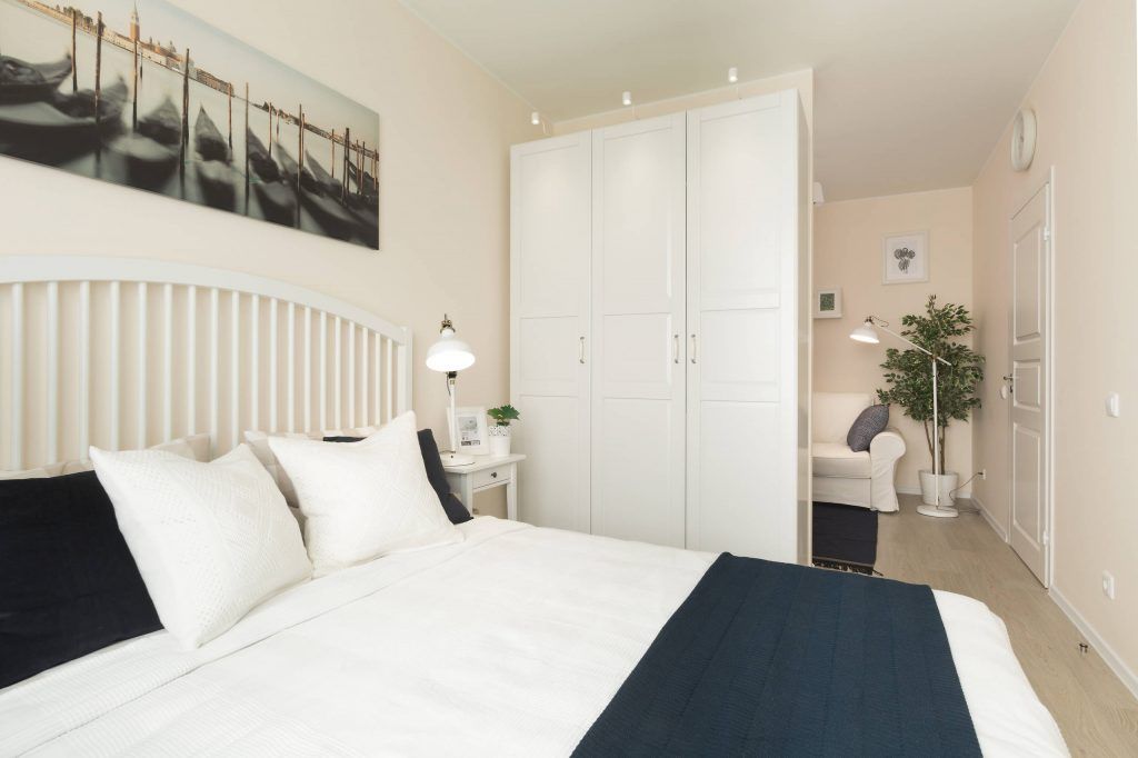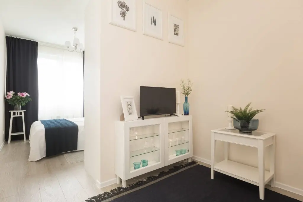 Deschide GaleriaPentru ca vorbim de un apartament cu o singura camera, dormitorul capata doua roluri diferite: cel de camera de zi si dormitor. Separarea celor doua zone se face cu ajutorul unui perete ingust ale carui parti sunt ornamentate cu un dressing si respectiv, o comoda cu aspect de vitrina.