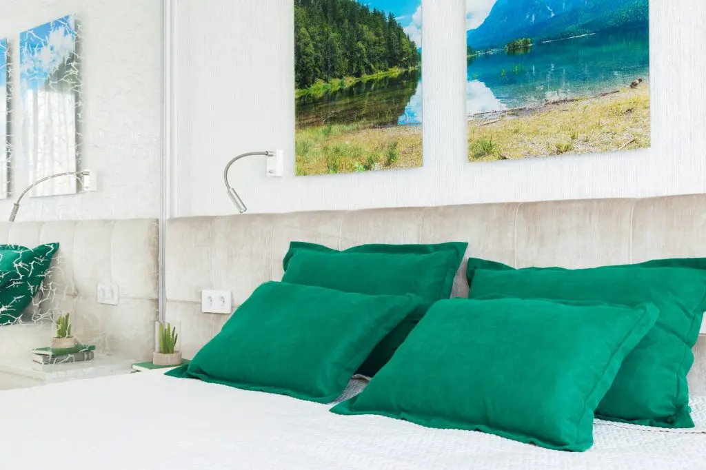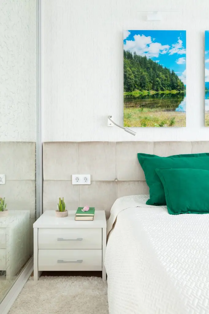 Acelasi tip de oglinzi le vom intalni si in dormitor, la nivelul unui dressing. Spatiul de aici este mic, dar bine amenajat si optimizat. Pernele decorative si tabloul tip canvas atrag privirea si inveselesc decorul neutru. Folosind astfel de nuante, incaperea este amplificata si mai luminoasa.