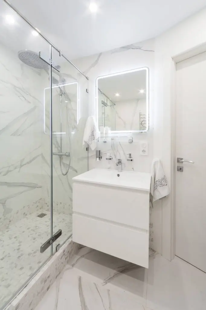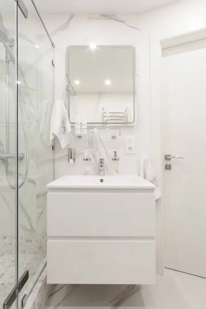 Pentru baie, s-au folosit placi ceramice care imita marmura si un iluminat uniform prin spoturi incastrate. Optand pentru o cabina de dus s-a dorit o optimizare a spatiului restrans din baie.