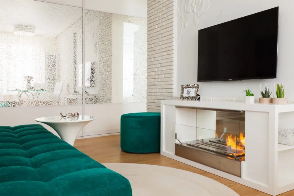 Pentru a realiza o trecere discreta, o zona pentru luat masa a fost amenajata in apropierea bucatariei. Astfel, a fost creata o legatura cu bucataria. De o parte si cealalta a mesei au fost dispuse simetric doua dulapuri tip soldat, care ne amintesc de ideea unui bufet pentru vesela. Pe langa aceste piese, au mai fost integrate o zona T V si un semineu care functioneaza pe baza de bioetanol.