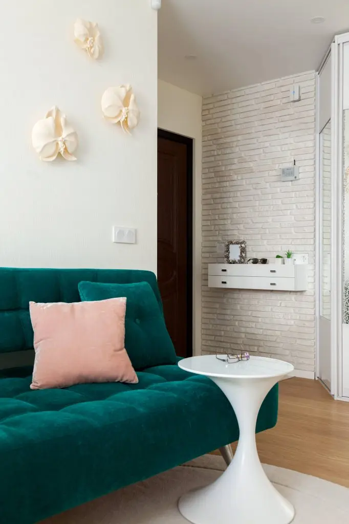 In camera de zi, designul urmeaza aceeasi linie minimala, fara a lipsi accentul de culoare. De data aceasta, vorbim despre un albastru-turcoaz care domina decorul si aici preponderent alb. Placarea cu caramida aparenta aduce un plus de textura spatiului.