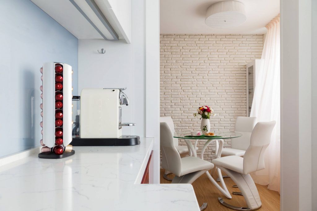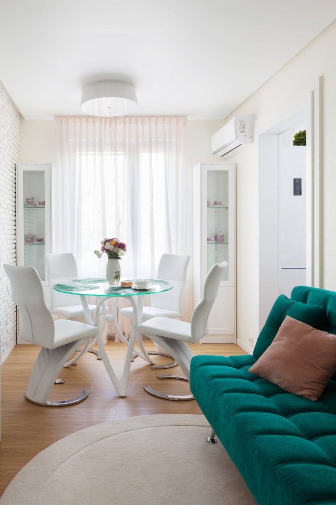 In camera de zi, designul urmeaza aceeasi linie minimala, fara a lipsi accentul de culoare. De data aceasta, vorbim despre un albastru-turcoaz care domina decorul si aici preponderent alb. Placarea cu caramida aparenta aduce un plus de textura spatiului.