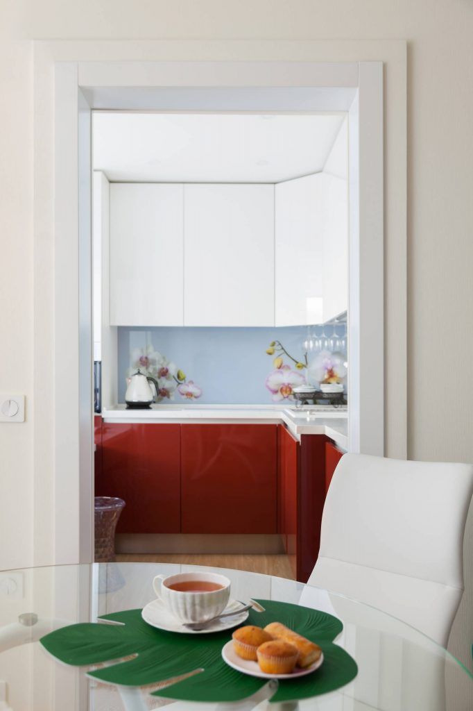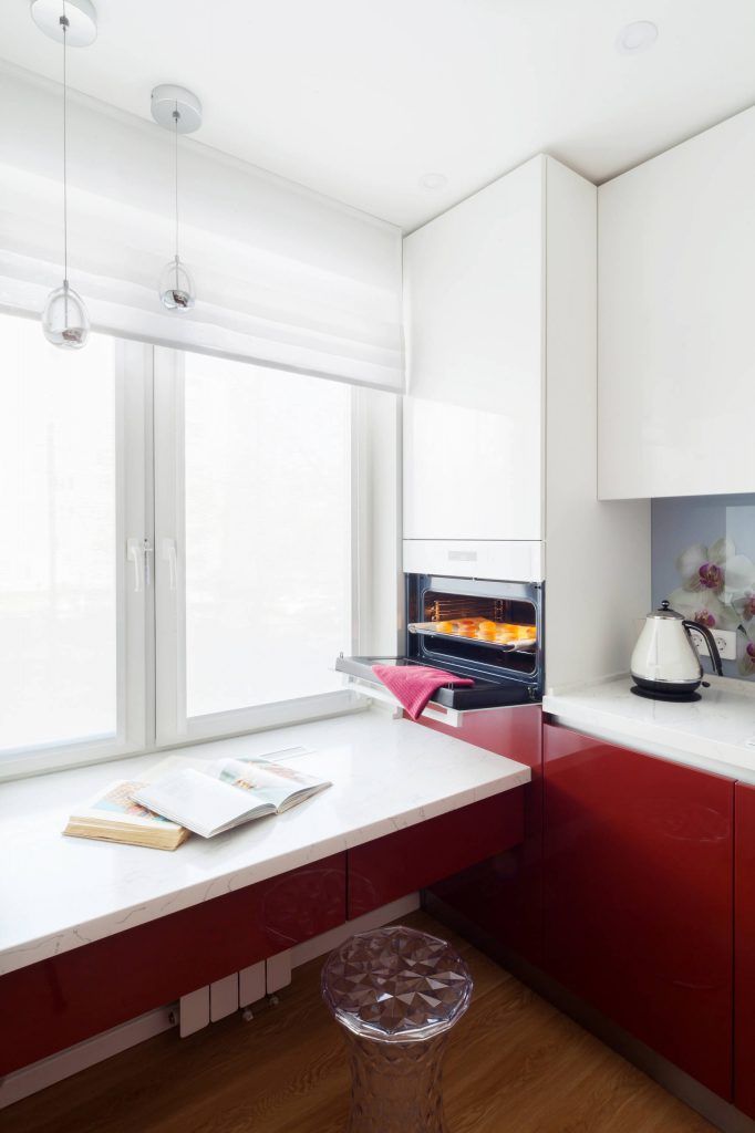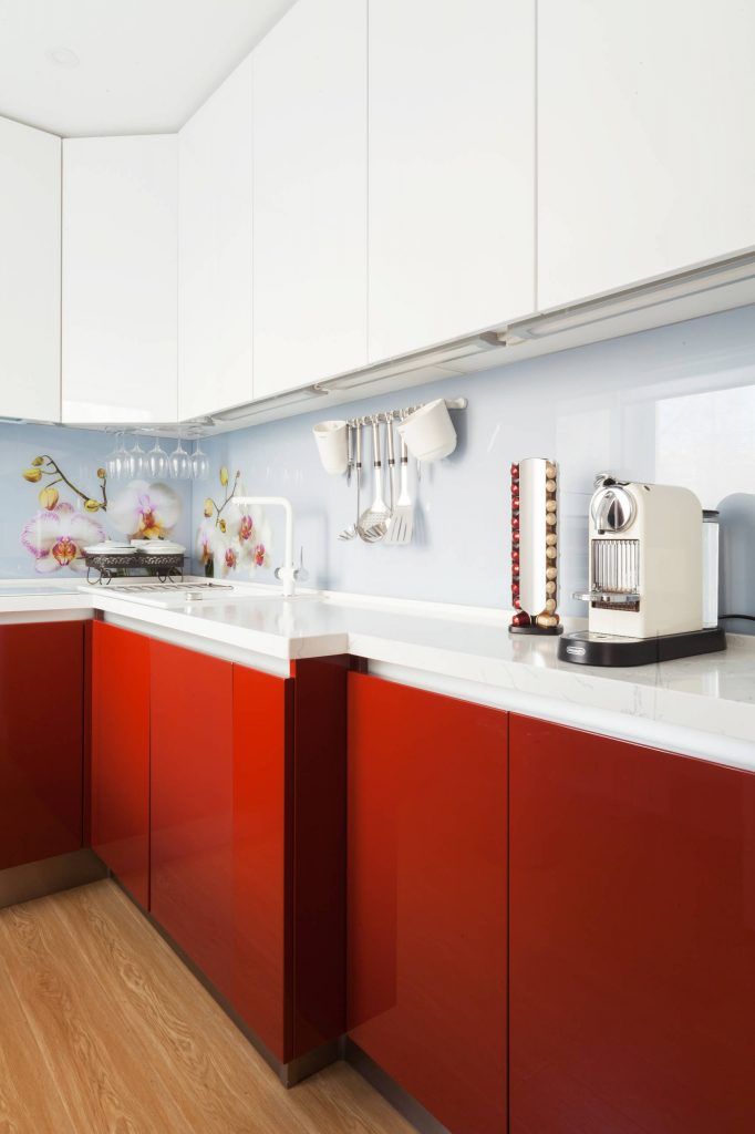 Bucataria este surprinzatoare prin rosul intens al dulapurilor principale. Nu te-ai astepta la o astfel de culoare intr-un spatiu mic! Albul dominant echilibreaza intensitatea rosului si pastreaza amenajarea luminoasa. Il poti vedea la nivelul dulapurilor suspendate, al blatului de lucru, al bateriei sau chiar la perdeaua in stil roman de la fereastra.