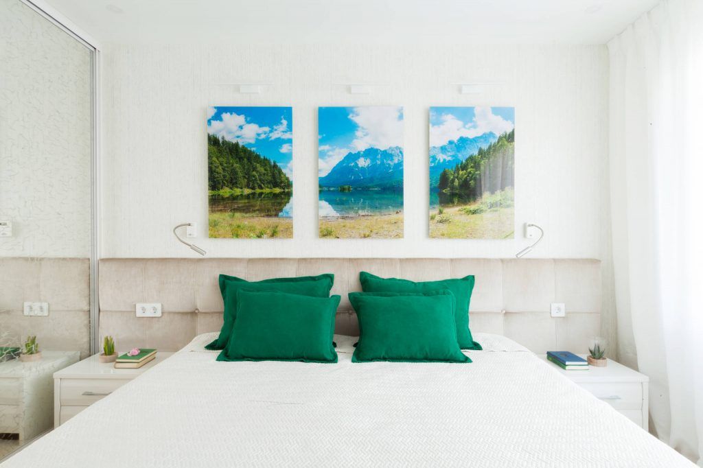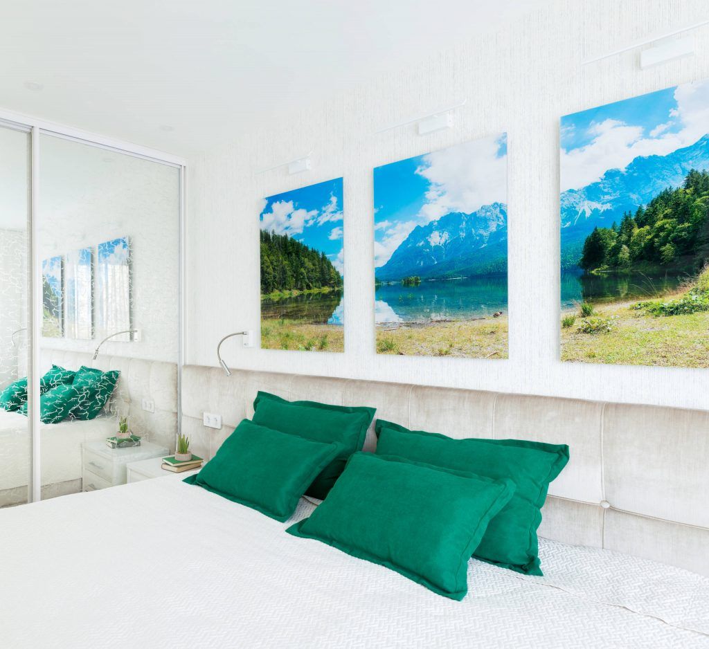 Acelasi tip de oglinzi le vom intalni si in dormitor, la nivelul unui dressing. Spatiul de aici este mic, dar bine amenajat si optimizat. Pernele decorative si tabloul tip canvas atrag privirea si inveselesc decorul neutru. Folosind astfel de nuante, incaperea este amplificata si mai luminoasa.
