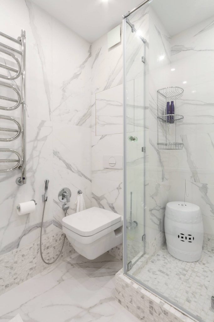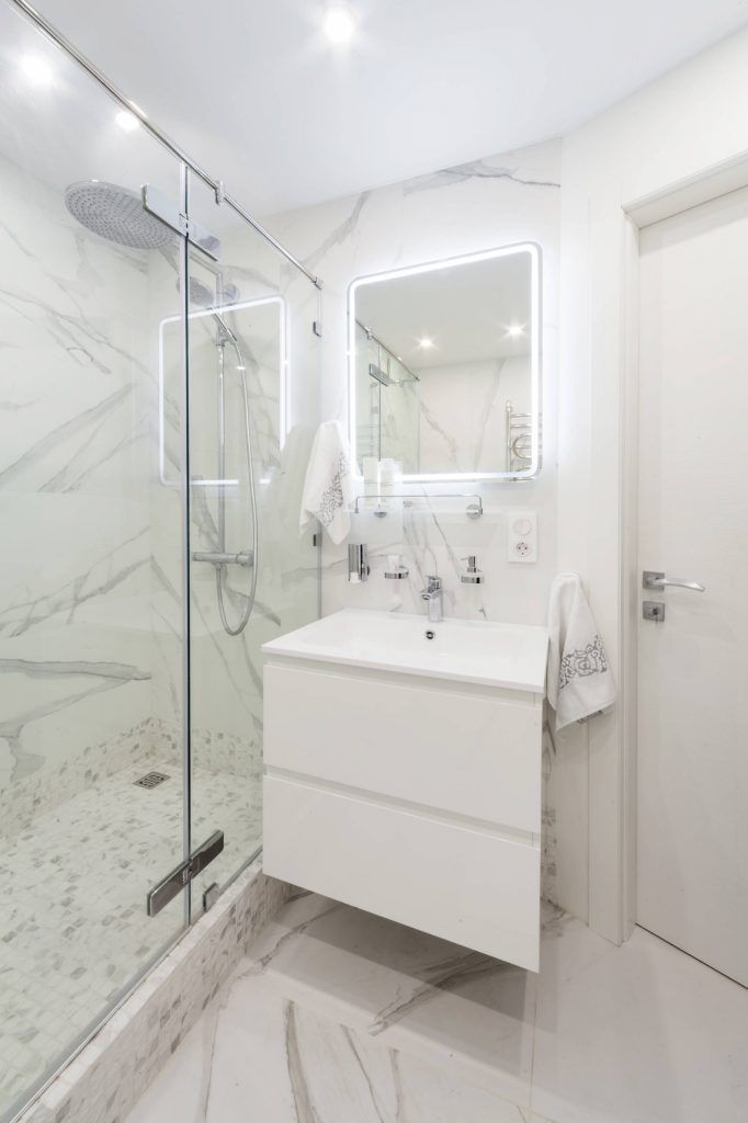 Pentru baie, s-au folosit placi ceramice care imita marmura si un iluminat uniform prin spoturi incastrate. Optand pentru o cabina de dus s-a dorit o optimizare a spatiului restrans din baie.