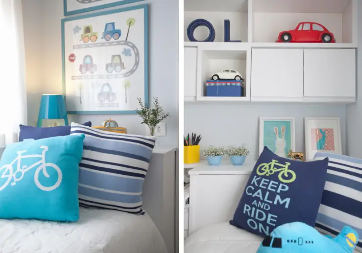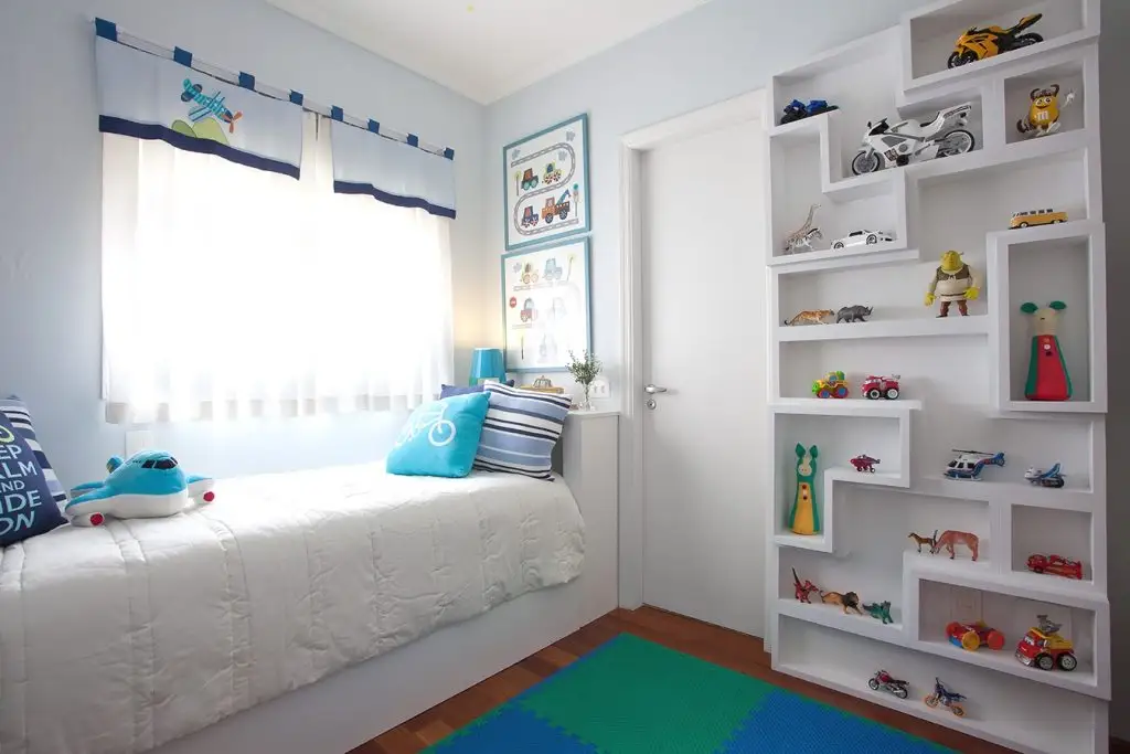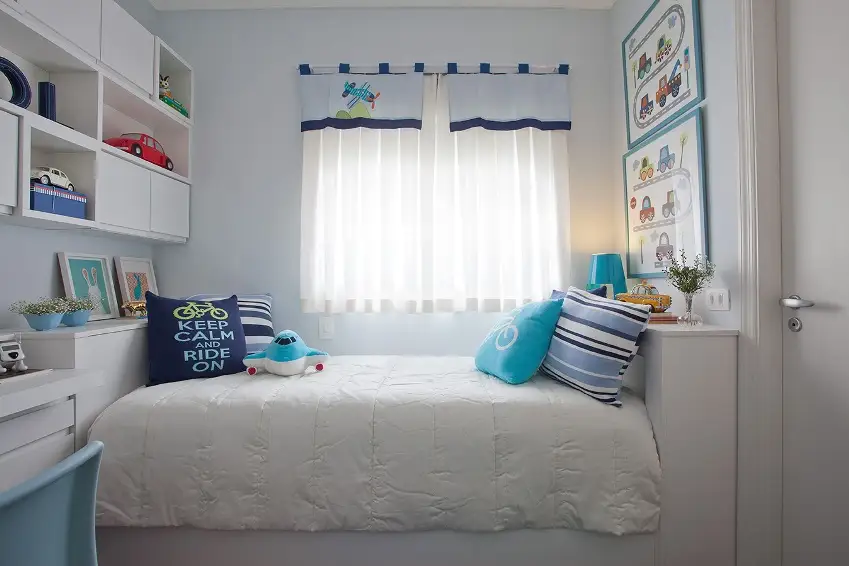 Accentele de albastru si albastru-turcoaz contureaza un decor bland, vesel, potrivit unei camere de copil. Fundalul predominant alb permite tuselor de albastru sa iasa in evidenta, dinamizand astfel spatiul. Desi vorbim despre o camera mica, paleta cromatica folosita reuseste sa ofere o senzatie placuta de spatialitate, gratie si unei bune iluminari naturale.
