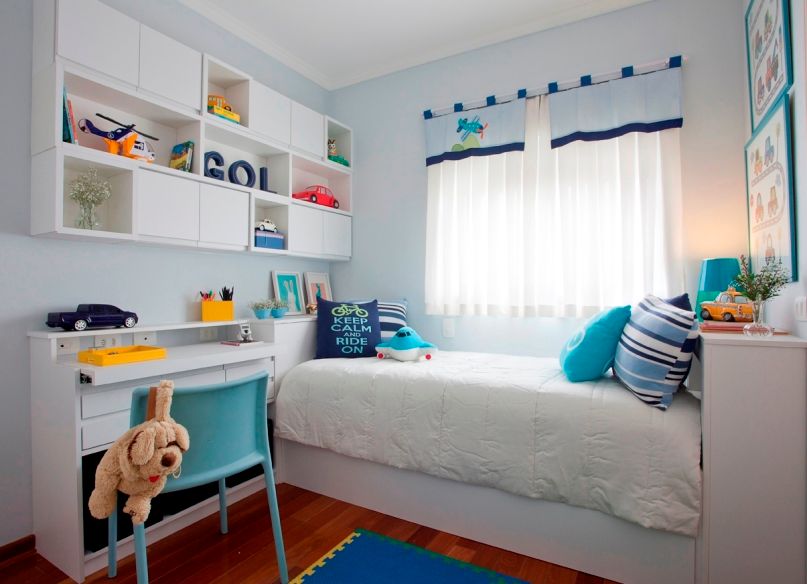 Accentele de albastru si albastru-turcoaz contureaza un decor bland, vesel, potrivit unei camere de copil. Fundalul predominant alb permite tuselor de albastru sa iasa in evidenta, dinamizand astfel spatiul. Desi vorbim despre o camera mica, paleta cromatica folosita reuseste sa ofere o senzatie placuta de spatialitate, gratie si unei bune iluminari naturale.
