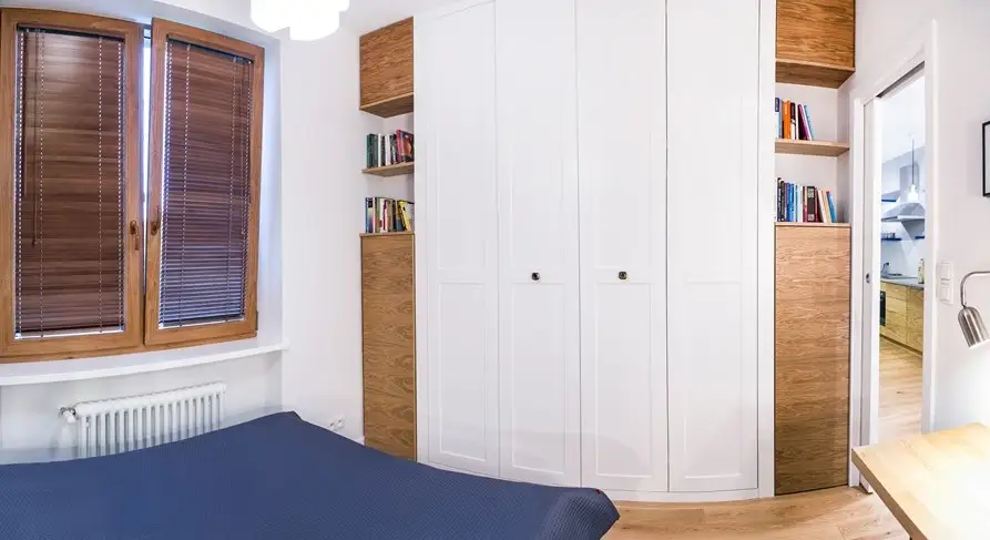 In acelasi timp, aceste nise joaca si rol de partitii, pe de o parte intre living si dormitor, si, de cealalta parte, pe o portiune mai redusa, intre bucatarie si restul camerei. In plus, pentru usile de la baie si dormitor au fost alese modele glisante in acelasi scop al optimizarii incaperilor (usile obisnuite, batante, ar fi luat din spatiu).