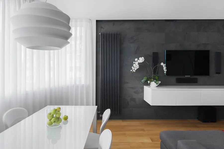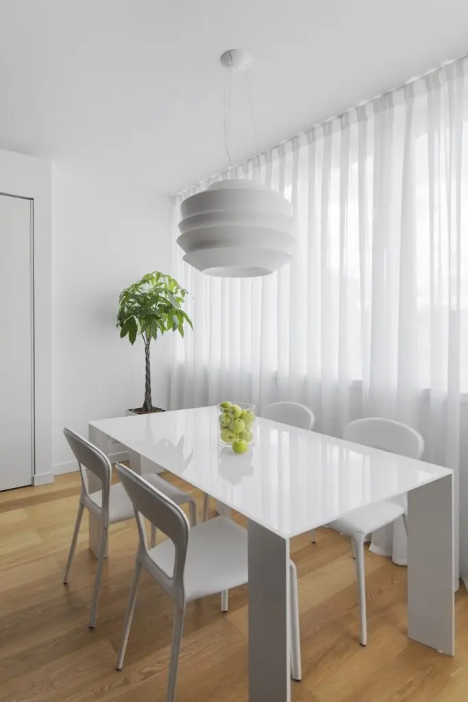 Intregul spatiu este concentrat pe functionalitati si forme, amenajarea fiind aerisita, degajata, eliberata de excesul de mobila. O cantitate de lumina naturala inunda spatiul, amplificat prin utilizarea albului. De la spatiul diningului complet alb, se face trecerea catre o canapea coltar gri, confortabila si un mobilier suspendat cu suprafete lucioase.