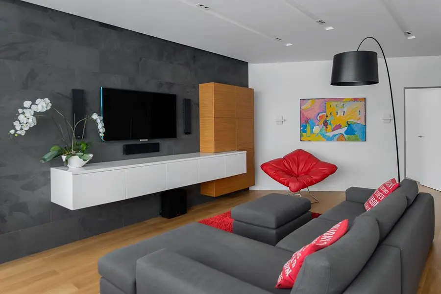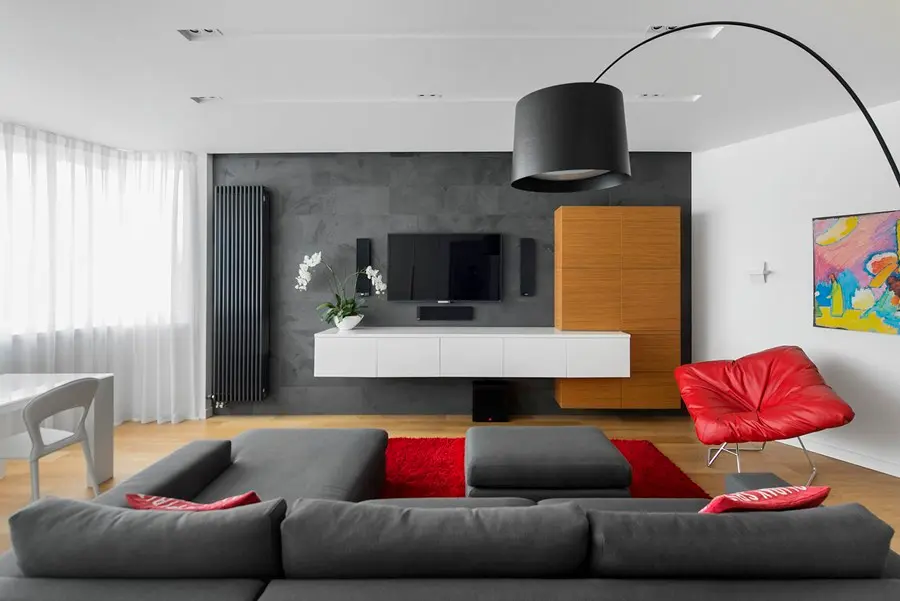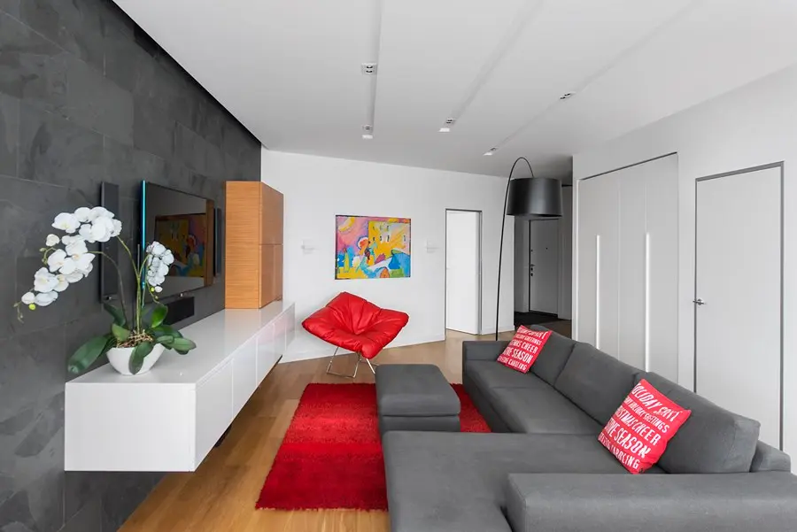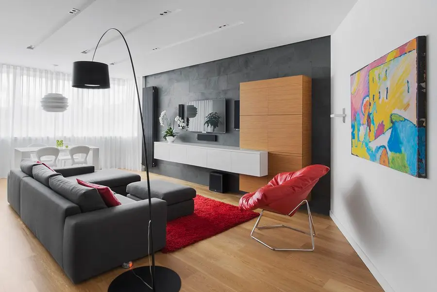 Covorul si scaunul-fotoliu, ambele rosii completeaza livingul intr-o maniera indrazneata. Nu putem omite nici lampadarul negru care echilibreaza intensitatea culorii.