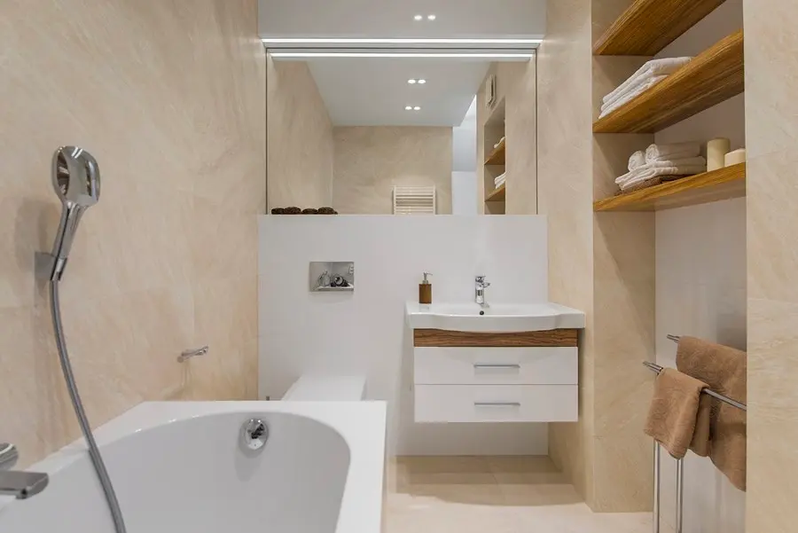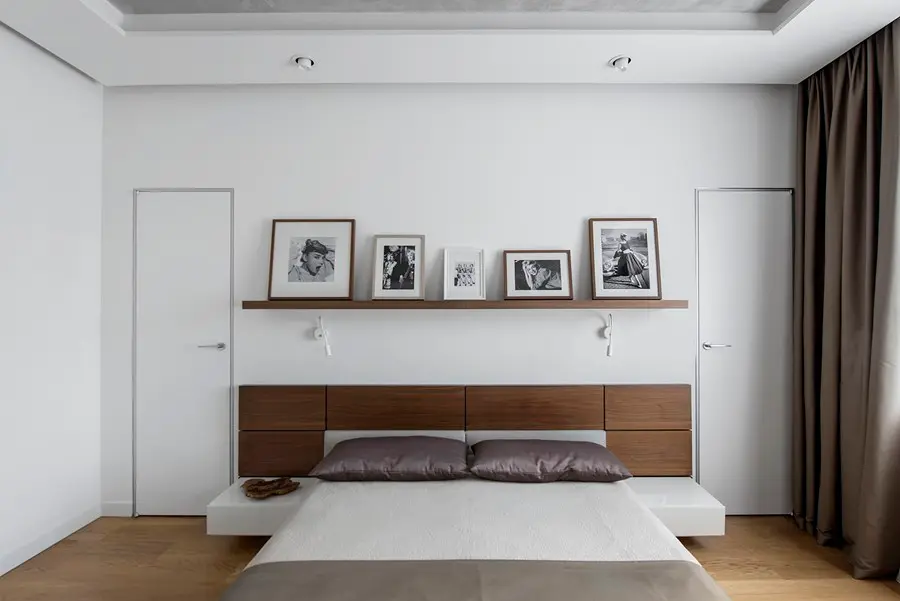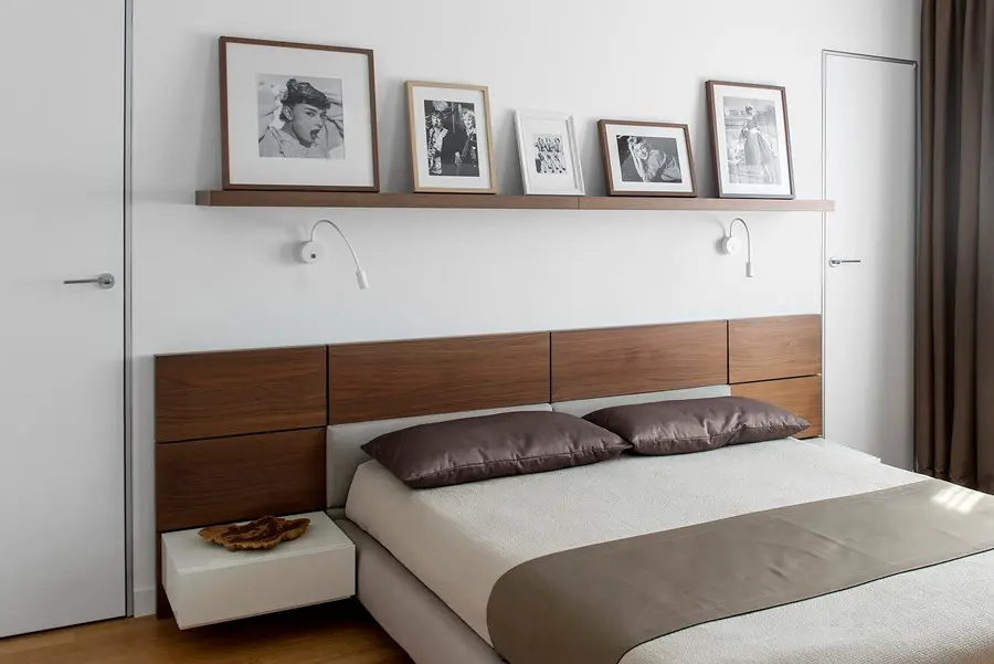 In dormitor vom intalni aceeasi linie simpla de amenajare cu o cromatica neutra centrata pe alb, bej si maro. Ne atrage privirea etajera lunga de deasupra tabliei patului, un loc pentru a expune tablouri sau rame foto, precum si budoarul care poate fi folosit si ca birou. Baia este un spatiu cald, relaxant prin placi ceramice bej care ne amintesc de textura lemnului.