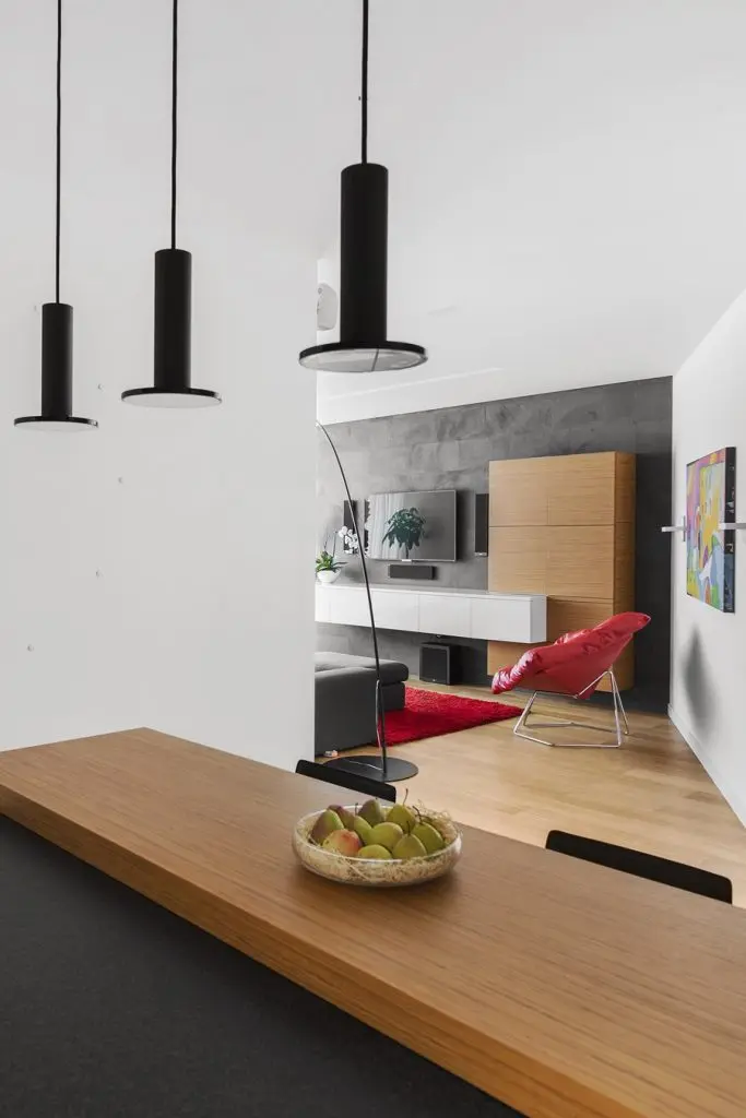 Deschide GaleriaPe un fundal preponderent alb se dezvolta functiunile unui living generos care include si diningul. Insertiile de negru si gri ne arata o combinatie cromatica clasica preferata multor designeri si decoratori pentru amenajarea spatiilor contemporane. Astfel, intre alb si negru, vom gasi nuante naturale de lemn si accente de rosu care sparg monotonia acestui decor minimalist.