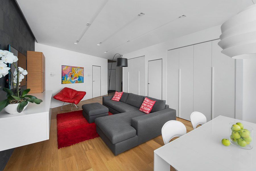 Deschide GaleriaPe un fundal preponderent alb se dezvolta functiunile unui living generos care include si diningul. Insertiile de negru si gri ne arata o combinatie cromatica clasica preferata multor designeri si decoratori pentru amenajarea spatiilor contemporane. Astfel, intre alb si negru, vom gasi nuante naturale de lemn si accente de rosu care sparg monotonia acestui decor minimalist.
