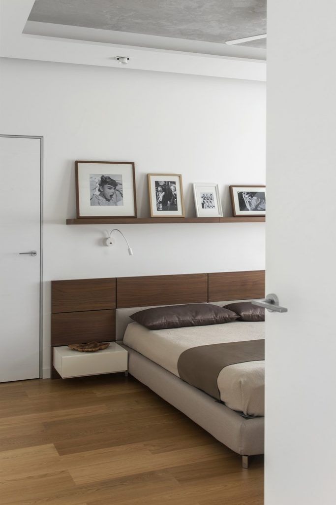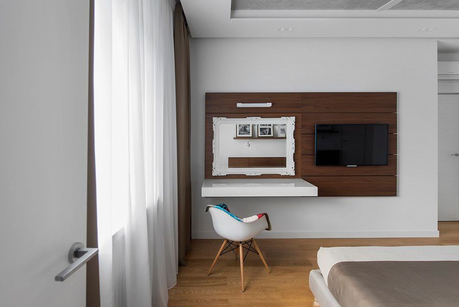 In dormitor vom intalni aceeasi linie simpla de amenajare cu o cromatica neutra centrata pe alb, bej si maro. Ne atrage privirea etajera lunga de deasupra tabliei patului, un loc pentru a expune tablouri sau rame foto, precum si budoarul care poate fi folosit si ca birou. Baia este un spatiu cald, relaxant prin placi ceramice bej care ne amintesc de textura lemnului.