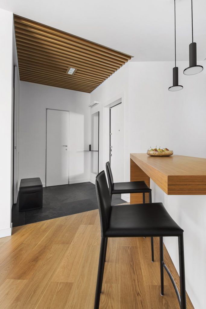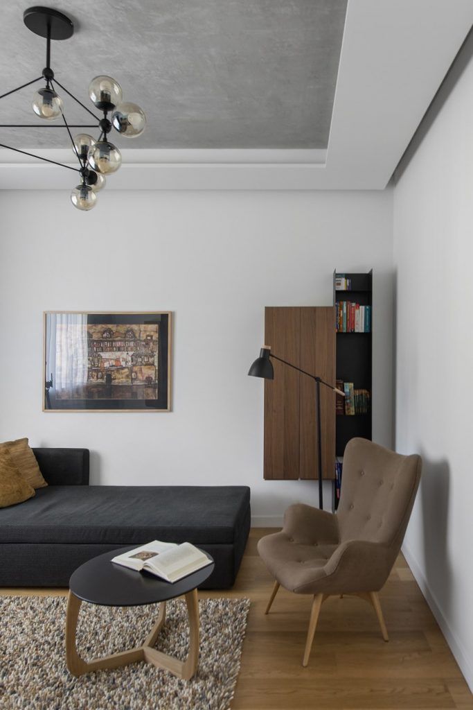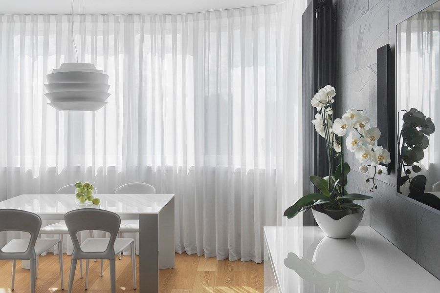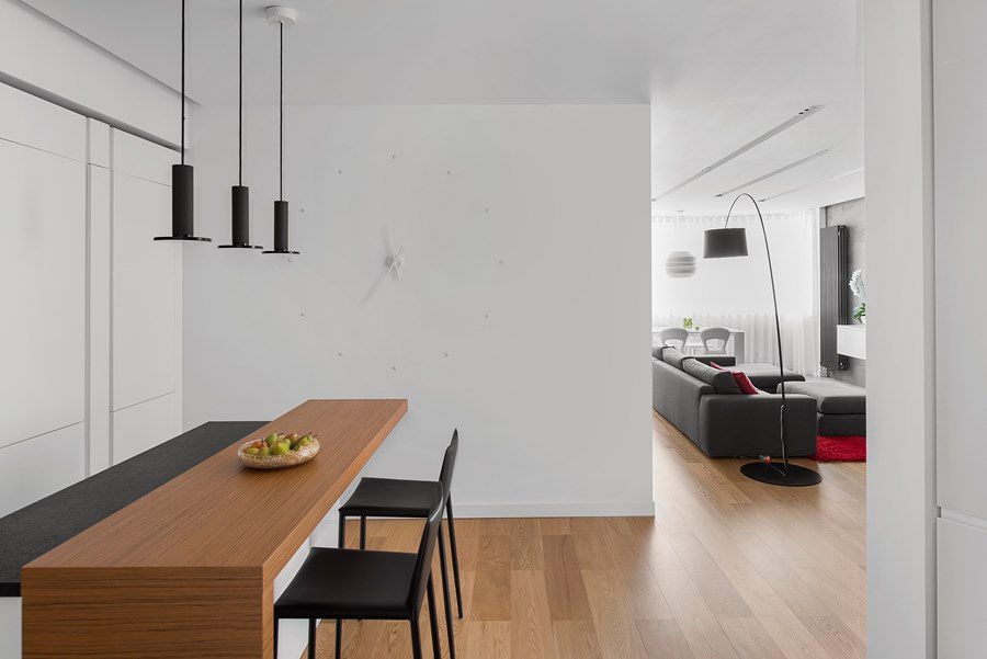 Intregul spatiu este concentrat pe functionalitati si forme, amenajarea fiind aerisita, degajata, eliberata de excesul de mobila. O cantitate de lumina naturala inunda spatiul, amplificat prin utilizarea albului. De la spatiul diningului complet alb, se face trecerea catre o canapea coltar gri, confortabila si un mobilier suspendat cu suprafete lucioase.