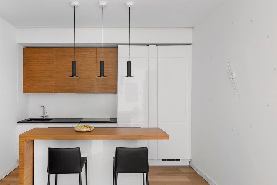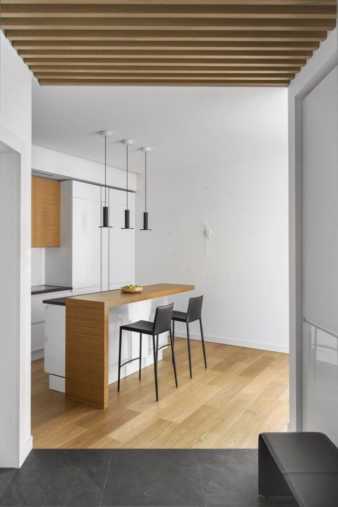 Livingul comunica cu bucataria prin spatiul deschis al holului. Zona dedicata gatitului este una mica, pastrand acelasi ton minimalist al amenajarii. Foarte interesant in acest sector este ceasul de pe perete, abia sesizabil. Un mobilier simplu cu electrocasnice incastrate decoreaza acest sector al locuintei.