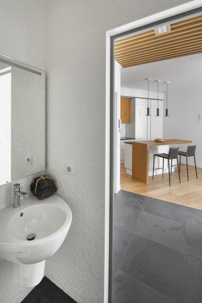 O abordare interesanta cu un efect deosebit o vom gasi in baia mica, unde flisele albe ofera un efect tridimensional, iar albul predominant mareste vizual spatiul.