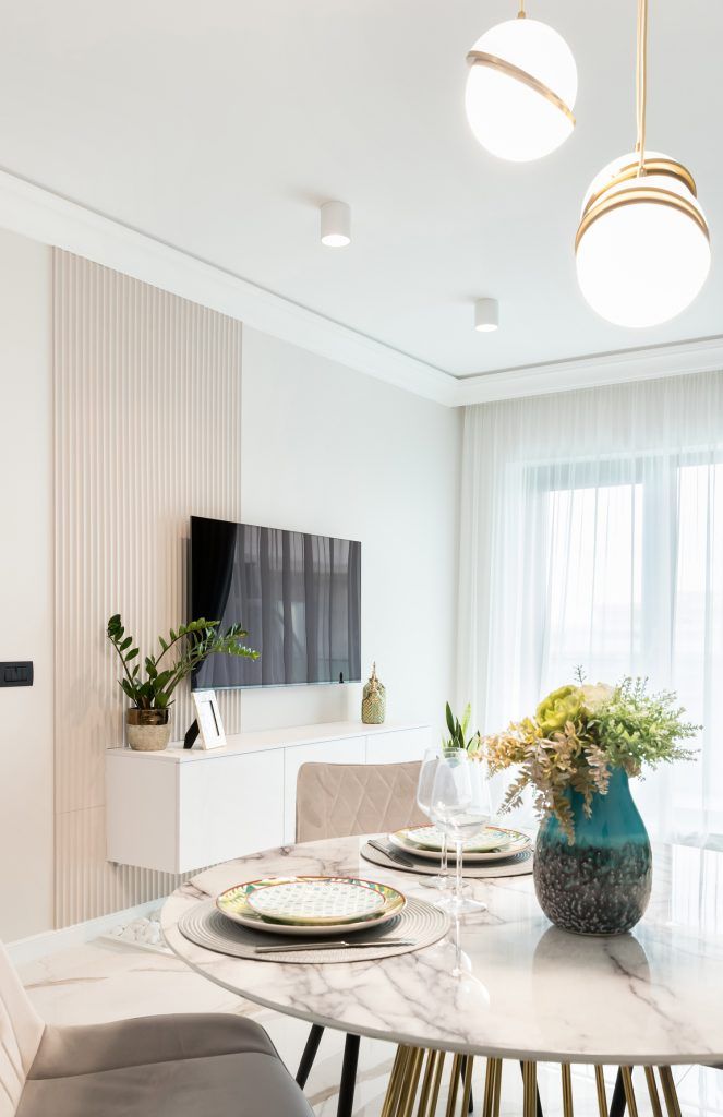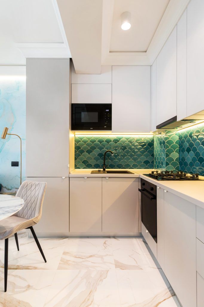 Contrablatul bucătăriei se armonizează perfect cu întreg spațiul, fiind complementar peretelui de marmură cu accente de baby blue și auriu. Elementele de auriu ce se regăsesc în întreaga amenajare, adaugă o notă elegantă spațiului și creează această atmosferă glam.